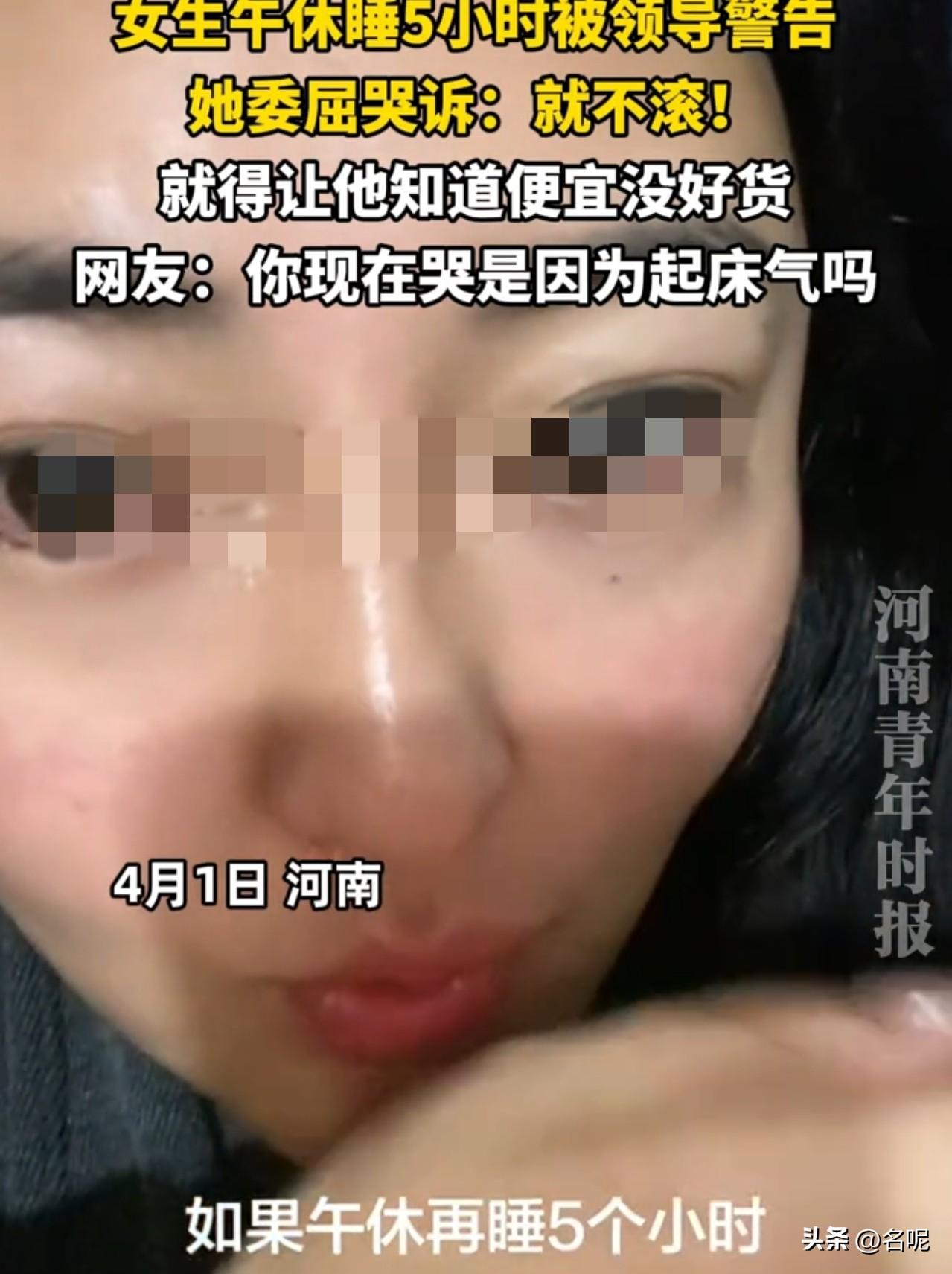 这逻辑绝,便宜没好货还可以这么解释! 河南,一女生午休睡5小时被领导警告了。女生哭诉“今天我领导说我,如果午休再睡5个小时,就让我滚蛋。我就不滚蛋,我就让他知道便宜没好货。” 这是从中午睡起,一直睡到五点,打卡下班?所以,这工资便宜了,就值3个小时上班时间。这逻辑绝了,梨花带雨也没影响女生思路敏捷。 我很少为资本家说话,但便宜,女生面试的时候不知道工资低吗?既然知道了,还干,不就接受8个小时上班时间值这个工资吗? 自己摆烂旷工在先,被领导警告,自己还有理了?既然自己有理,那还哭啥?是没睡醒起床气吗? 网暴自己何必呢?