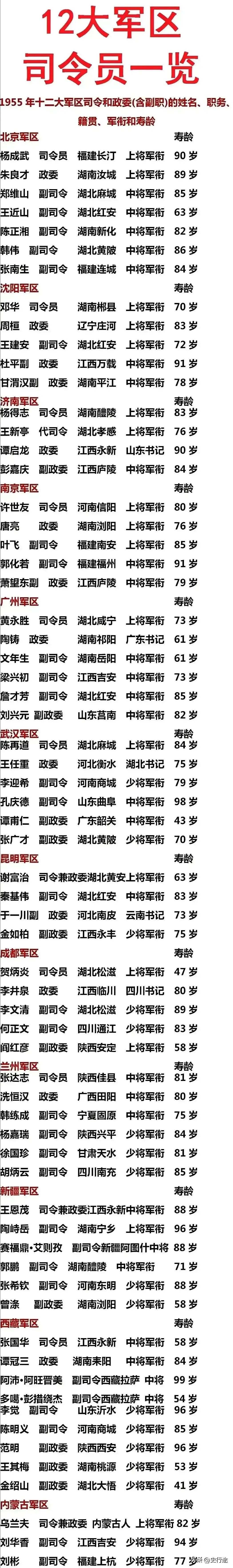 1955年十二大军区司令政委 一九五五年的军队调整,说起来像是改编制,往深处看,却像一盘重新摆开的棋。解放战争后期,四大野战军一路南下北上,旧有格局慢慢定住,全国形成六大军区。那时候的军区司令,几乎清一色都是元帅级人物,分量摆在那里,谁镇哪一方,外界一看就明白。到了授衔这一年,六大军区一下扩成十二大军区,局面变得更细,分工更密,位置也更讲究。照常理,大军区司令多半该由上将来坐。可名单摊开,偏偏有三位中将挤了进去。事情到这里,才真正有了嚼头。 先看那批上将司令,基本都对得上他们的资历和战场履历。沈阳军区是邓华,四野出来的猛将,解放战争能打,抗美援朝时又担任过志愿军代理司令,这样的人坐镇东北,谁都不会觉得轻。北京军区交给杨成武,他是华北野战军里打出来的虎将,又是聂荣臻手下最倚重的一员,聂荣臻到中央工作,推荐他接任,也算顺着部队脉络往下走。济南军区由杨得志担任,红军“三杨”里,他资格最老,声望也最硬。广州军区是黄永胜,四野一员悍将。 南京军区由许世友坐镇,这个人脾气硬,兵也硬,从胶东一路带出二十七军那支三野主力,后来又从山东军区司令的位置调去南京,摆在那个地方,很合适。武汉军区归陈再道,这也是刘邓大军里冲杀出来的人物,放在中部,压得住阵。成都军区是贺炳炎,昆明军区是谢富治,内蒙古军区则由乌兰夫担任。乌兰夫不仅是上将,还是蒙古族重要干部,这个安排,本身就带着鲜明的地区特点。 名单看到这里,路数还算明白。可往下一瞧,西藏军区张国华,新疆军区王恩茂,兰州军区张达志,三个人都是中将。大军区司令由中将来担任,在当时绝不是随手一放。尤其是和前面那一串上将名字摆在一块,更显眼,也更耐人寻味。 张国华的情况最直接,几乎没有悬念。二野十八军进军西藏,是实打实啃下来的硬任务。那不是一般意义上的开进,山高路险,气候恶,补给线长得吓人,走错一步都得出大麻烦。十八军怎么进,怎么站住,怎么把局面慢慢稳下来,张国华一路都在里头。西藏军区成立后,让他来当司令,根本不只是看军衔,而是看谁最熟这片地方,谁和这支进藏部队绑得最紧。话说得直白一点,那位置不是给肩章看的,是给能扛事的人坐的。张国华虽是中将,真放到西藏那个场面里,别人还未必比他更合手。 王恩茂的任用,也是一个道理。他原来是一野第二军政委,第二军进军南疆,那是他的老部队,兵情、地情、干部关系,他都熟。新疆的情况和内地不一样,地域辽阔,民族成分复杂,边防意味又重,光有名头不行,得懂局面,得会拿捏分寸。王震作为一野重要将领,对新疆的事情很有发言权,他推荐王恩茂担任新疆军区司令,这一推,不是照顾私人情面,而是因为王恩茂的履历和新疆的现实需要正好扣上。真要找个军衔更高、名气更大的将领过去,也未必比他更熟、更稳。边疆重地用人,很多时候不图热闹,就图一个踏实。 张达志的情形,比前两位更耐琢磨。张国华和王恩茂,都是因为直接参与了边疆经营,属于功劳和经验摆在那里。张达志担任兰州军区司令,背后除了他的个人条件,还牵出当时军中一层不太写在纸面上、却谁都明白的格局问题。 一九五五年十二大军区司令名单里,红一方面军系统的人占得很重。邓华、杨成武、杨得志、黄永胜,足足四位。红二方面军有贺炳炎。红四方面军也不弱,许世友、陈再道、谢富治,都在其中。这样一摆,陕北红军这一支若在大军区司令层面没有代表,就显得失衡。军队不是简单排座次,它有历史,有渊源,有各支部队长期形成的心理认同。大调整的时候,中央不可能不顾这一层。说得土一点,这就像搭台子,哪一边都不能悬空,少了一根柱子,大家心里都别扭。 可陕北红军系统里,谢子长、刘志丹早已牺牲,闫红彦虽然是上将,却长期在地方工作,不在军区主官这条线上。这样一来,张达志就显出来了。他是一野第四军军长出身,长期又在西北地区工作,和那片地方有联系,和西北部队也有根底。这个人摆到兰州军区,不突兀,也压得住。于是问题就清楚了,张达志之所以能以中将身份担任兰州军区司令,并不只是个人运气好,而是他的资历、地区经历、所属系统,刚好都对上了那一年军队调整的需要。 这样再回头看,就会发现那三位中将并不是同一种“例外”。张国华靠的是进军西藏、经营西藏的不可替代,王恩茂靠的是南疆老底子和王震的明确推荐,张达志则连着西北系统与陕北红军的平衡。表面都是中将坐大军区,里头的门道,一点都不一样。 事情还没停在这里。一九五六年,福建军区升格为大军区,十二大军区随之变成十三大军区。叶飞担任司令。叶飞是福建红军的重要代表人物,这个安排,同样不是随手点名。福建的位置太特殊,沿海,前沿,分量不轻,主官既要有军中威望,也得对地方熟门熟路。叶飞恰恰两样都占。看到这里,整盘棋就越来越清楚了。 名单写在纸上,看着冷,背后其实很烫,像一群老将重新落座,每个人为什么坐在那里,都是有来路的。