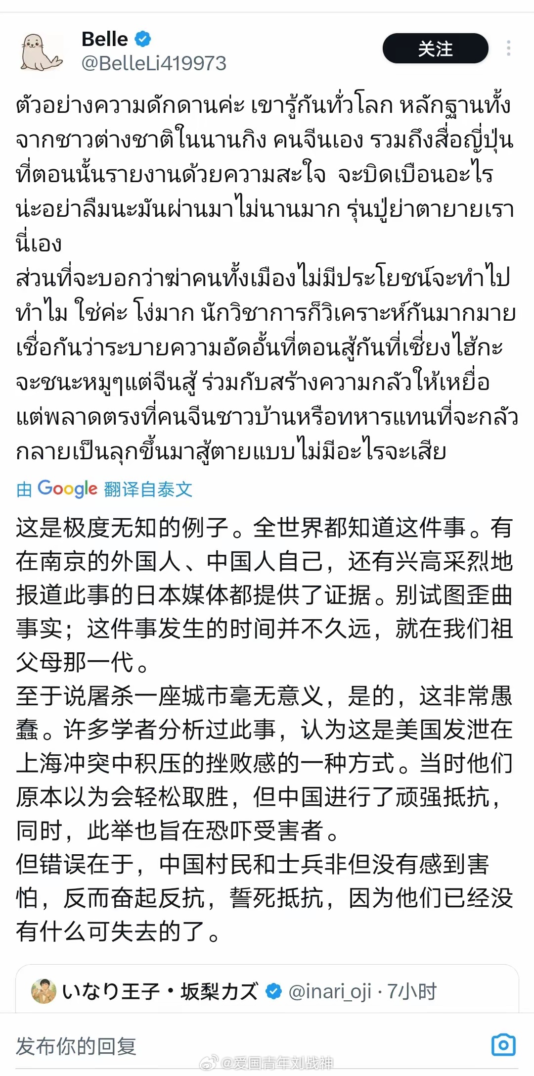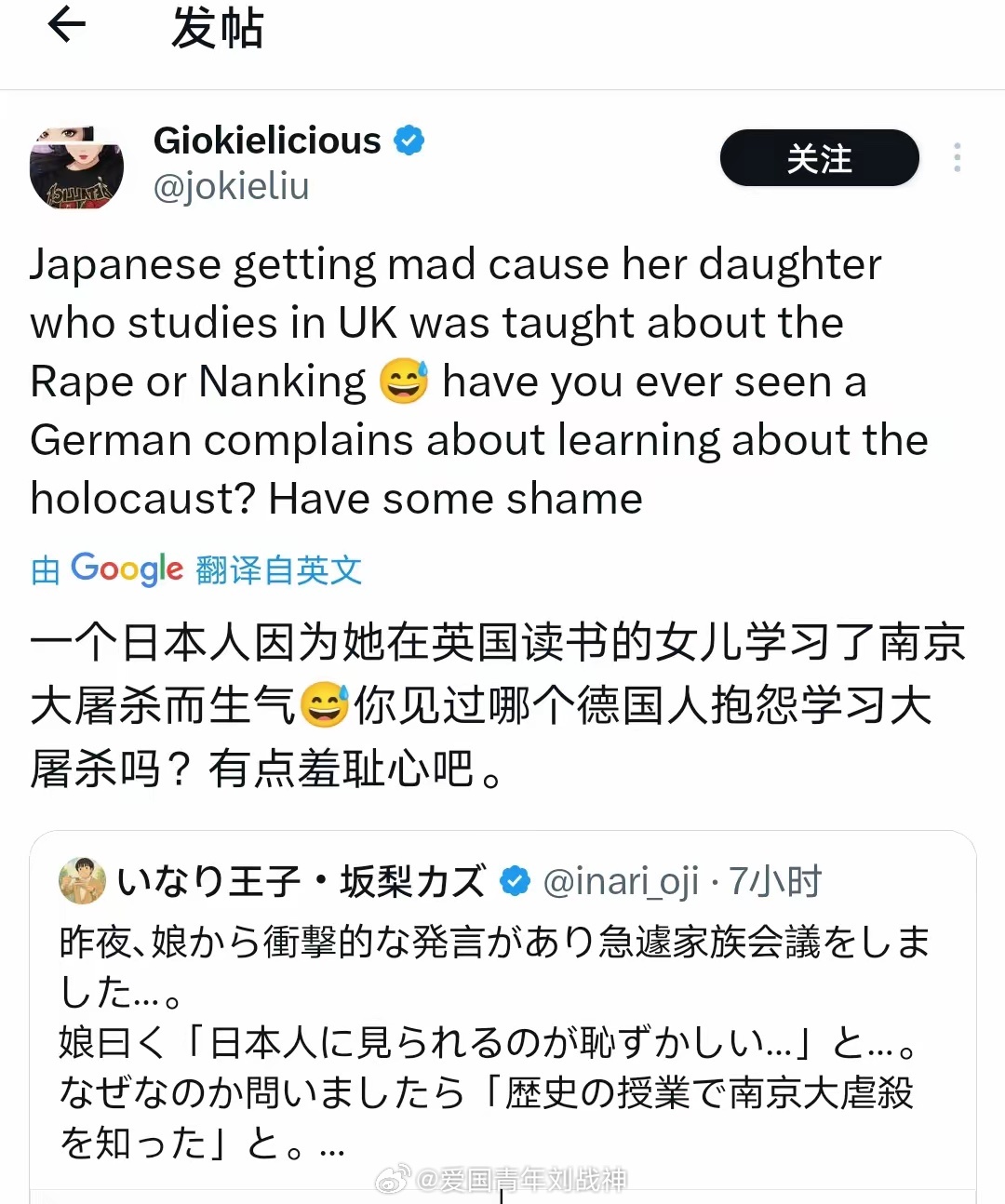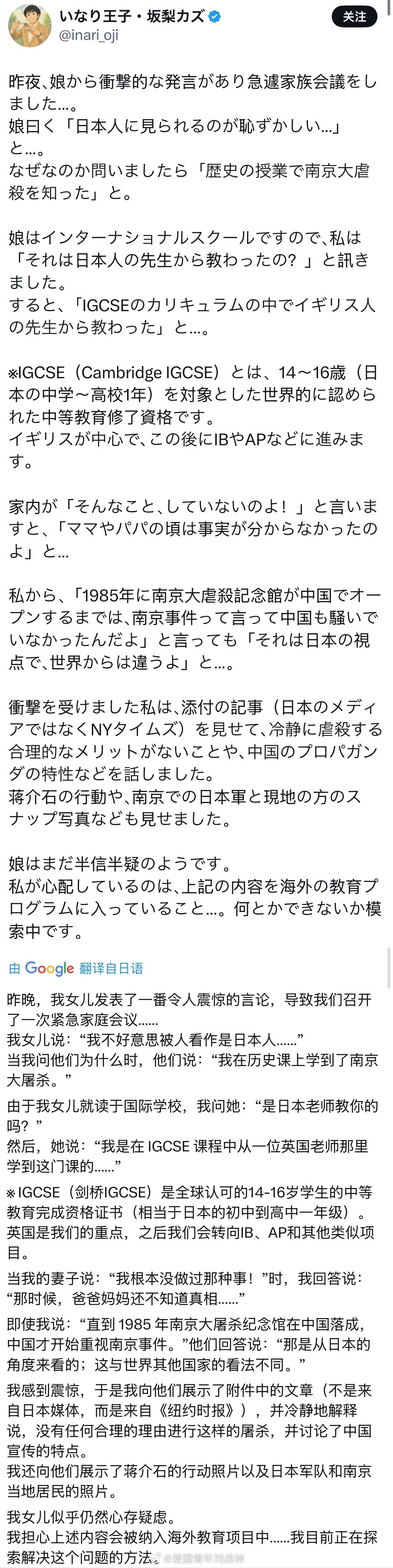 一对日本夫妇在X上吐槽,说读国际学校的女儿从英国老师那里学了南京大屠杀,竟说“被日本人看到很羞耻”。