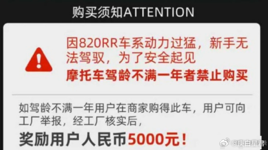 张雪机车820RR系列的售价,比同级别的进口大牌低了将近一半甚至更多,但性能却更好,这使得一大批人开始蠢蠢欲动。这里面有老骑士,也有那些在屏幕前看了几年机车视频、理论知识比谁都丰富、但实际连档都挂不利索的“精神车手”。问题就出在这里。820RR车系的动力,实在太猛。它的调校、它的爆发力,都是为赛道而生,根本不是为了一个刚拿驾照的新手准备的。就像一匹烈马,你让一个刚学会骑马的人上去,结局大概率不是“策马奔腾活得潇潇洒洒”,而是“人仰马翻最后痴痴傻傻”。张雪团队显然是清楚这一点的。于是他们做了一个在商业上看起来自断财路的决定:明确禁止向摩托车驾龄不满一年的人出售这款车。