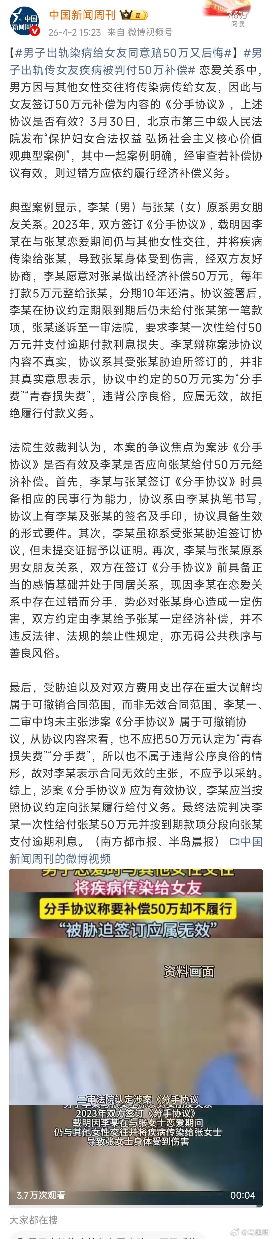 男子出轨染病给女友同意赔50万又后悔男子出轨传女友疾病被判付50万补偿