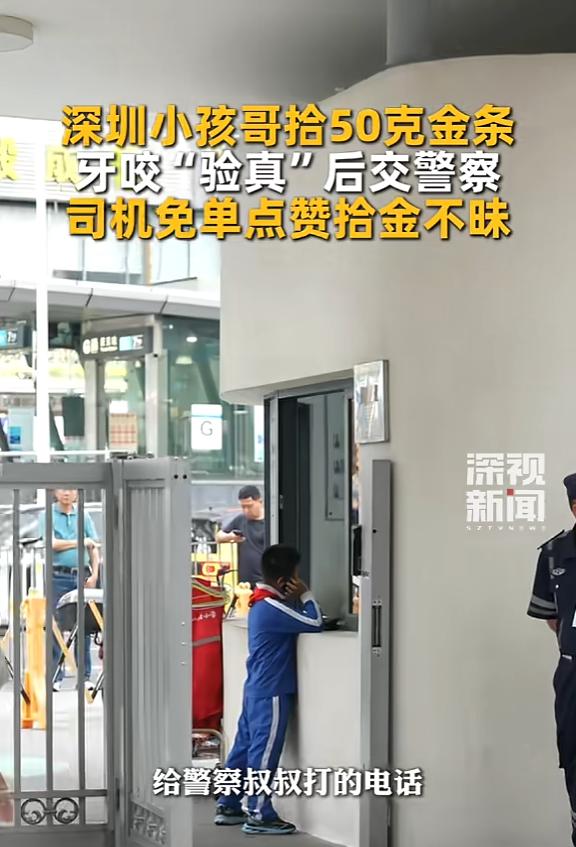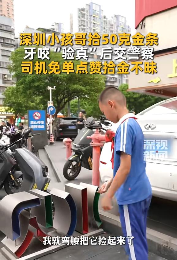 拾金不昧!近日,广东深圳,一11岁男孩在上学途中,捡到一个小布袋,里面有一块“投资足金”字样的金条,重约50克,为了确定真伪,男孩用牙咬了一口,觉得是真的,便立马用电话手表报了警,并守在原地等民警到来!网友:真是好样的! 3月27日早上8点多,深圳罗湖区田贝四路附近,翠北实验小学11岁的学生李麒瑞正走在上学路上。 路过人行道时,他瞥见路边有个不起眼的小布袋,看着不像垃圾,就顺手捡了起来。 打开袋子一看,里面是块沉甸甸的金属块,上面清晰印着“投资足金”四个字,掂着就很有分量。 李麒瑞当时有点不敢相信,长这么大哪见过这东西,为了确认是不是真金,他学着大人的样子,拿起来用牙轻轻咬了一口,感觉质地偏软,确实是黄金的手感。 刚好有同学路过,他就把金条拿给同学看,俩人一合计,按当时的金价算,这50克的金条差不多值四五万块钱。 要知道这笔钱对一个小学生来说,无疑是天文数字,但李麒瑞脑子里没别的念头,只想着失主丢了这么贵重的东西,肯定急坏了。 他没犹豫,直接掏出电话手表拨通110,跟民警说清捡到金条的事和具体位置,然后就守在学校门口,安安静静等着警察过来。 这不是他第一次这么做,之前捡到身份证、学生卡,他也都是第一时间想办法归还或交给警方。 大概10分钟后,翠竹派出所的民警赶到现场,在学校老师和保安的见证下,对金条拍照登记,随后带回派出所妥善保管。 民警当场就夸他,小小年纪面对这么贵重的财物不贪心,还有这么强的判断力和责任感,特别难得。 事后李麒瑞说,这事没什么特别的,爸妈和老师一直教他,不是自己的东西绝对不能拿,捡到贵重物品交给警察是最该做的事。 事情到这还没结束,暖心的事还在后面,3月30日,老师陪着李麒瑞去派出所办理后续手续,路上打了辆出租车。 司机师傅听他们聊起捡金条报警的事,当场就被感动了,说什么都不肯收车费。 师傅说,这孩子眼里有光,心里装着善良,这样的正能量必须鼓励,车费就当是给孩子的点赞。 李麒瑞也特别感慨,说原来自己一个小小的善举,真的能感染别人,还能传递下去。 目前,这块50克的金条还在警方妥善保管中,民警正全力排查线索,争取早日找到失主,把东西完璧归赵。 这事传开后,网友们议论纷纷,有人点赞也有人有不同看法。 有网友说:“这才是孩子该有的样子,不贪不占,家教和学校教育太成功了,比多少金钱都珍贵。” 也有网友觉得:“还是孩子太单纯,长大了就懂了,四五万可不是小数目,换自己未必能做到。” 其实这事看着不大,却特别让人触动,11岁的孩子面对几万块的金条,没有丝毫私心,第一时间选择报警等待,这份纯粹和正直,比金子本身更值钱。 更难得的是善意的传递,孩子拾金不昧,司机用免单回应,一来一回,把温暖和正能量传了开来。 现在总有人说世风日下、人心浮躁,但这个小男孩用行动证明,善良和正直从来都没消失,尤其是在孩子身上,这份纯粹最打动人。 家教的引导、学校的教育,加上社会的正向回应,共同守护了孩子心里的光。 小事见人品,小善暖人心。希望这样的事能多一些,也希望每个善良的举动,都能被看见、被善待、被传递。 对此您有什么不同的看法,可以在评论区留言讨论!!!