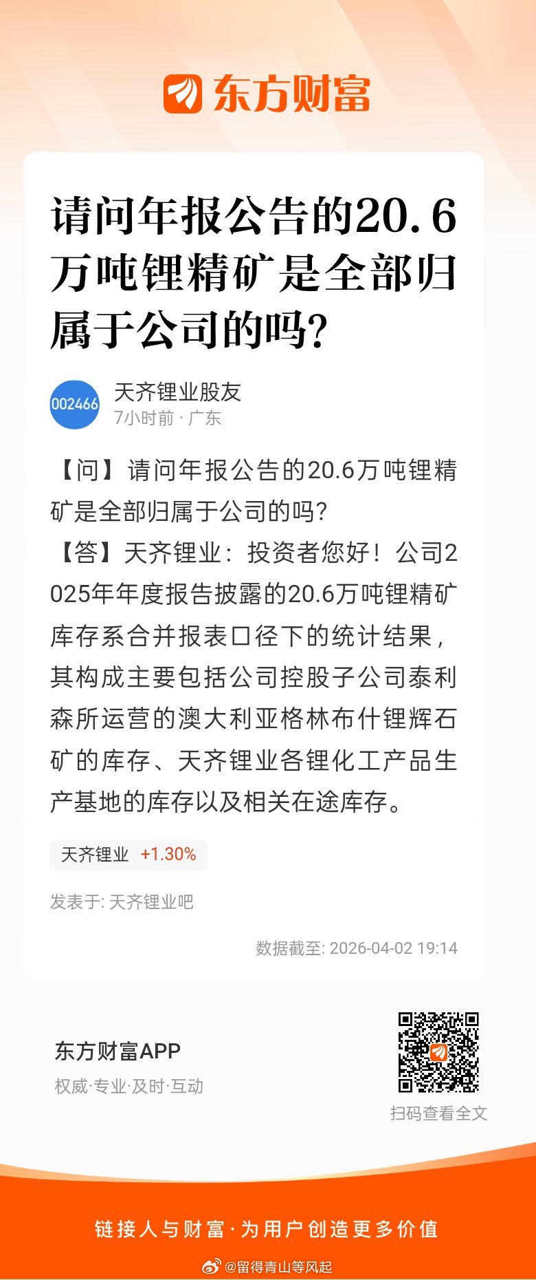 东方财富股票【问】请问年报公告的20.6万吨锂精矿是全部归属于公司的吗?【答】天齐锂业:投资者您好!公司2025年年度报告披露的20.6万吨锂精矿库存系合并报表口径下的统计结果,其构成主要包括公司控股子公司泰利森所运营的澳大利亚格林布什锂辉石矿的库存、天齐锂业各锂化工产品生产基地的库存以及相关在途库存。网页链接 (来自