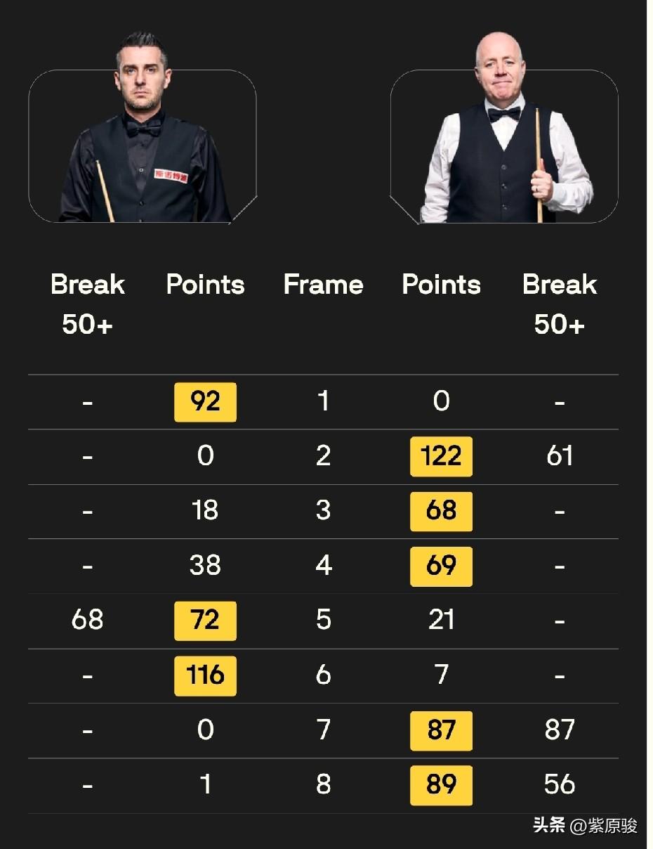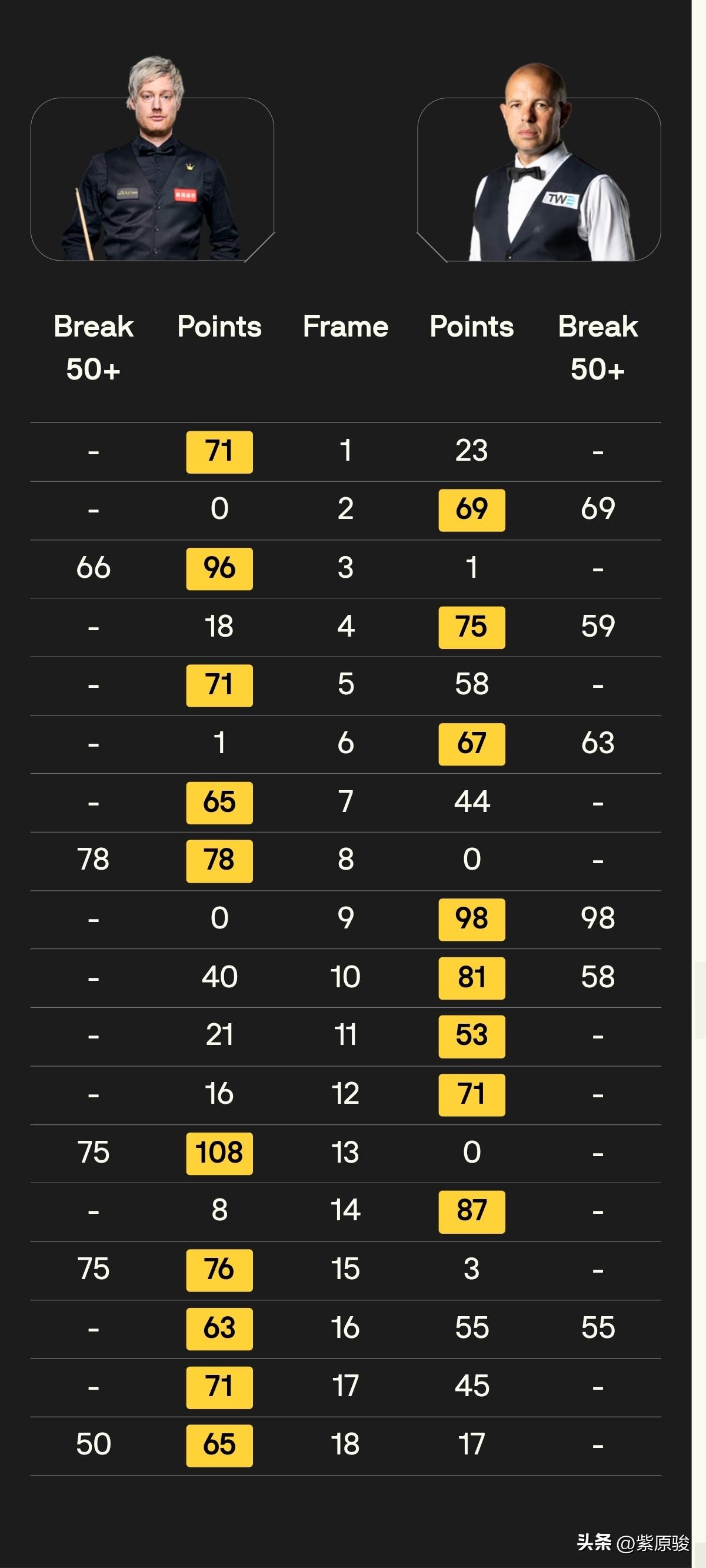尼尔·罗伯逊10-8战胜霍金斯,晋级巡回锦标赛4强。希金斯5-3领先塞尔比。明天凌晨2点,赵心童续战韦克林,希金斯续战塞尔比。 今天晚上,巡回锦标赛结束了一场1/4决赛,结果尼尔·罗伯逊10-8战胜霍金斯。霍金斯在第一阶段3-5落后的情况下连追4局,7-5反超。第13局,尼尔·罗伯逊拿下,阻止了霍金斯的连胜势头。第14局霍金斯87-8再胜,8-6领先。 之后罗伯逊连赢4局,10-8战胜霍金斯,晋级4强。其中第16局,霍金斯拿到55分被逆转。 今天晚上另一场比赛,塞尔比亮相,迎战卫冕冠军希金斯。前4局,希金斯让一追三,3-1领先。希金斯也真是神了,不但长台准度很好,运气也不错,多次晕球进袋。 局间休息后,塞尔比连追两局,总比分变成3-3。之后,希金斯又连胜两局,5-3结束了第一阶段的比赛。 明天凌晨2点,赵心童续战韦克林,塞尔比续战希金斯。 第一阶段赵心童5-3领先韦克林,但双方分差不大,赵心童加油!