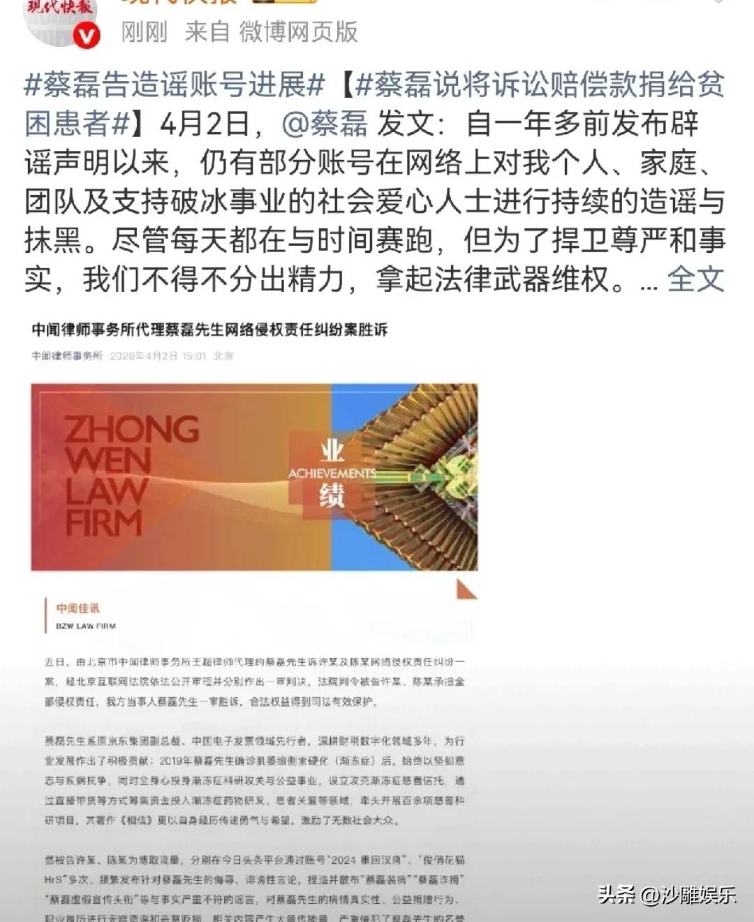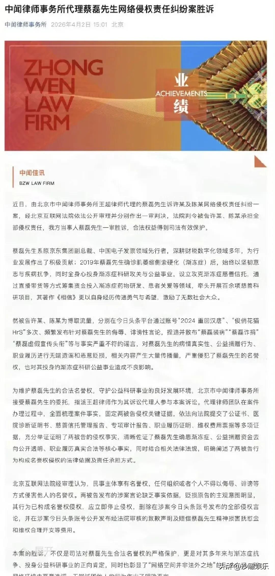 蔡磊,直接硬刚! 4月2日,渐冻症抗争者、前京东副总裁蔡磊突然在社交平台郑重发文,字里行间透露着几分尘埃落定的如释重负,又有几分不容侵犯的强硬。 他正式公开了与网络谣言拉锯战的最新进展:北京互联网法院一审宣判,两个长期造谣他的头条账号“俊俏花猫HrS”和“2024重回汉唐”败诉! 法院判得很清楚——立刻删除所有侵权言论,在账号主页置顶致歉十日,并承担相应赔偿责任。 要知道,蔡磊现在的身体状况,已经差到即使四个人的同时搀扶下,他也已经完全无法迈步挪动。过去一年多的维权之路,对普通人来说尚且耗费心力,对他而言更是难上加难。但他硬是在分秒必争的“破冰”事业之外,为尊严杀出了一条血路! 说实话,这场官司之所以这么痛快,全因为造谣者的嘴脸太丑恶,而蔡磊方的诉求格局太敞亮。 造谣者有多离谱?这两个账号在一年多的时间里,为了博取流量,捏造并散布了“蔡磊装病”“蔡磊诈捐”“蔡磊虚假宣传头衔”等一系列荒诞谣言。两年间,相关诽谤信息的累计阅读量高达数千万,引发了大量不明真相网友的误解和抨击。 最荒诞的一幕来了——截至发稿,这两个账号仍未删除相关内容,也并未致歉。其中“2024重回汉唐”甚至在4月1日发文,说自己对判决结果表示不服,准备上诉。明知故犯到这种地步,也是没谁了! 维权的人有多清醒? 蔡磊的态度那叫一个高下立判。他没有哭诉卖惨,也没有贪图赔偿。他直说“赔偿金额不是我的目的,需要的是法律的公正宣判和公开的道歉”,并且承诺所获赔偿款项将全部捐给贫困渐冻症患者。 这一波操作,用网友的话说,“简直是把造谣者的脸按在地上反复摩擦”。 案件影响有多恶劣?这些恶劣的谣言,不仅对蔡磊和身边人造成了极大的精神伤害,还严重干扰了团队工作以及病友们生死时速的生命抢救,更是对全社会爱心和善良的赤裸裸践踏。 虽然法律还了蔡磊一个清白,但我还是要说一句公道话——一个连吞咽都需要将食物打成糊状、再过两遍细筛的人,却要被人污蔑成“诈捐装病”,这种为了流量毫无底线的谣言,真是把人性的阴暗面演绎到了极致。 蔡磊这次胜诉,最大的意义不在于赢了多少钱,而在于他给所有网络造谣者提了个醒:网络绝非法外之地,法律不会冤枉一个好人,更不会放任恶意中伤者肆意妄为。 同时也给那些善良的人提了个醒:面对是非纷争,不要让别有用心的人利用了你的正义感,永远不要让键盘声盖过理性的思考。 这场维权之战蔡磊打得很漂亮,但他也明确表态,若造谣者在一审判决后仍拒不悔改,坚决维权到底的决心绝不动摇。生命不息,破冰不止。 希望下一次的好消息来得更快一些,也愿这个倔强的“破冰者”能等到解药出现的那一天!