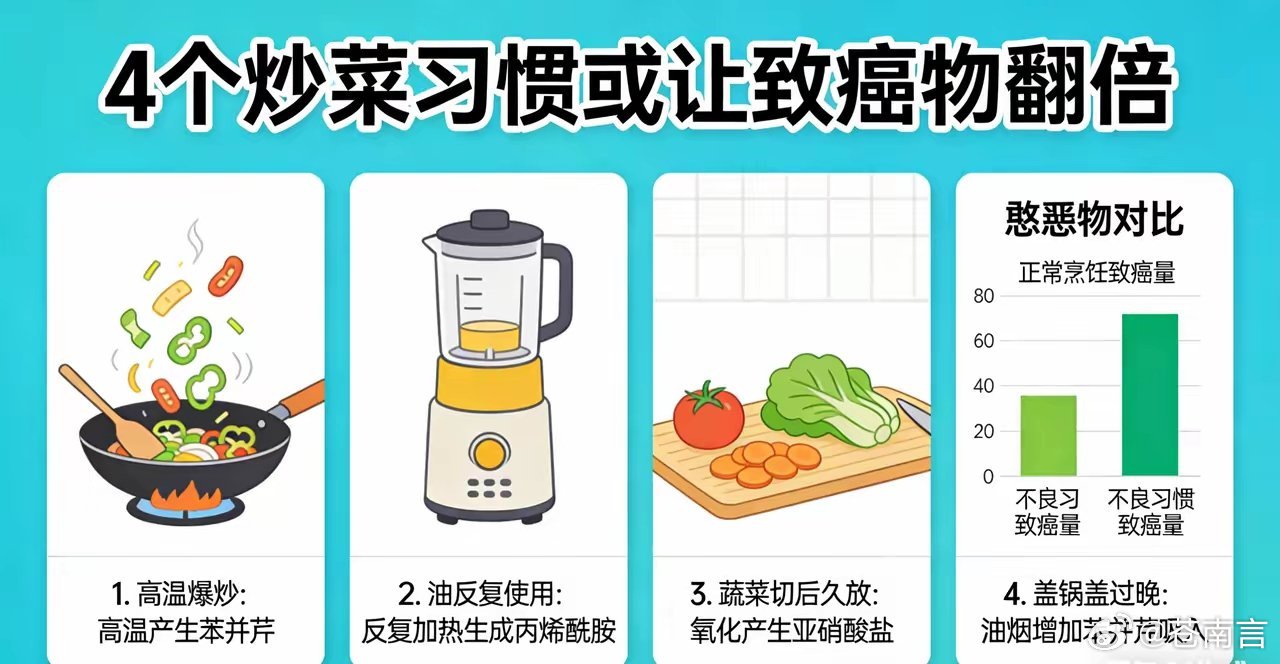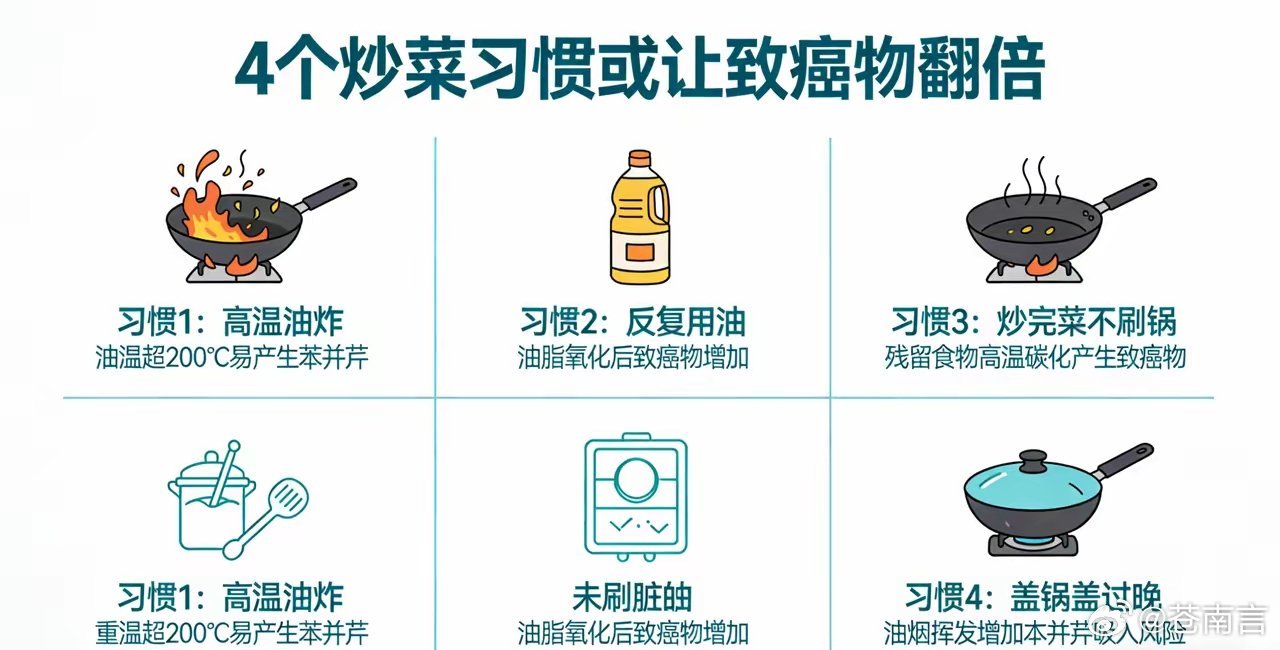 4个炒菜习惯或让致癌物翻倍4个炒菜习惯或让致癌物翻倍很多人天天炒菜,却不知错误习惯会让厨房暗藏健康风险,甚至使致癌物大幅增加。炒菜时油温过高,食材易产生苯并芘、杂环胺等强致癌物;反复使用炸过食物的油,有害物质会不断累积;锅烧到冒烟才下料,油烟中同样含有大量致癌物质,长期吸入危害肺部健康;炒完一道菜不刷锅直接炒下一道,残留焦糊物会持续生成致癌物。想要吃得健康,应控制油温、及时洗锅、避免剩油反复使用,减少高温爆炒,从细节降低致癌风险,守护家人饮食安全。朋友们我说的对吗?