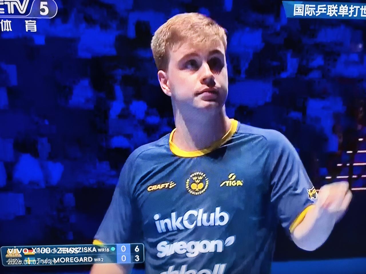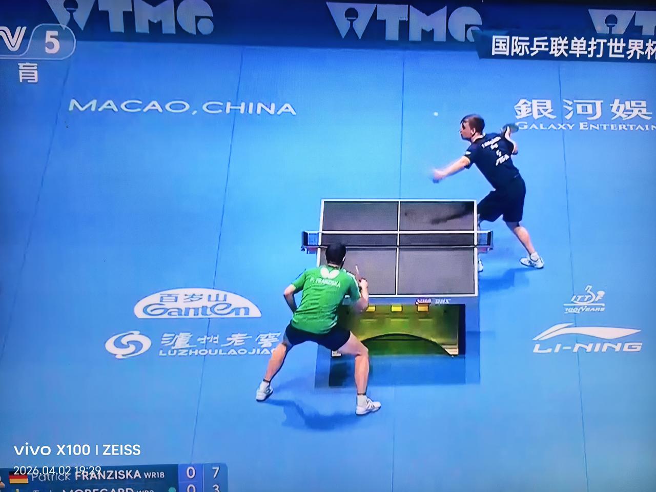 莫雷加德🇸🇪13-11拿下了第一局,先胜弗朗西斯卡🇩🇪! 感觉一直领先却最终丢了这一局的弗朗西斯卡要被气死了 这一局开始不久,莫雷加德🇸🇪被裁判判罚发球角度,小莫发起鹰眼挑战,挑战结果是30.64º[捂脸],当时小莫也要气死了[捂脸]。 ​​​ 这是2026澳门国际乒联单打世界杯男单1/8决赛。 2021年以来,两人有四次交手,两人各胜两次,距今最近的一次交手是在2025年仁川冠军赛上,弗朗西斯卡4-3获胜。 上一轮弗朗西斯卡淘汰了国乒周启豪后气势如虹。 莫雷加德是本站二号种子,奥运会亚军,今天发挥真的不错,目前第二局小莫又11-5赢了!