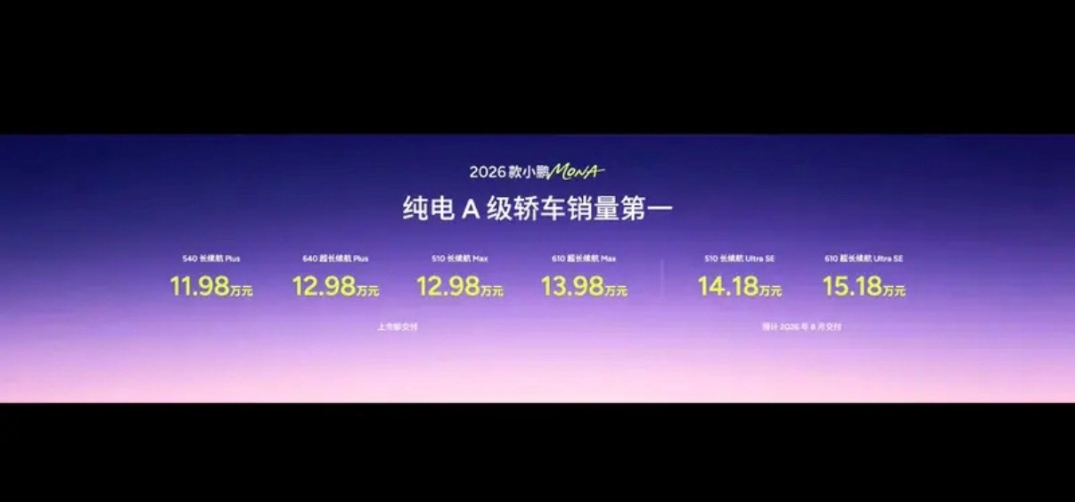 【2026款小鹏MONA M03上市 售11.98万元起】4月2日,2026款小鹏MONA M03正式上市,售价11.98-15.18万元,其中Ultra SE车型预计2026年8月交付。2026款小鹏MONA M03提供全新配色,并全系搭载天玑AIOS 6.0。