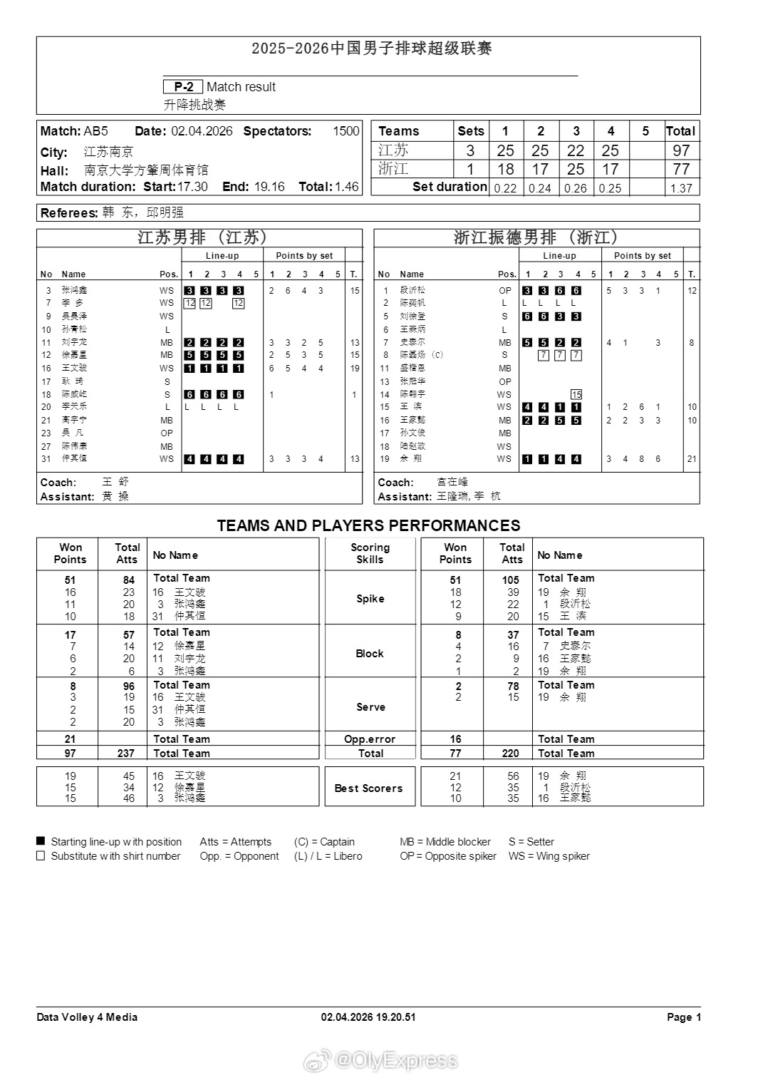 排超联赛 4月2日南京,排超男排联赛江苏3-1(25-18/25-17/22-25/25-17)浙江技术统计。