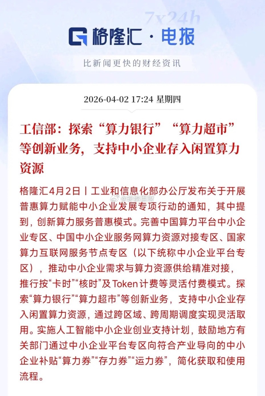 晚上,算力板块迎来利好消息,明天有望迎来反弹简单的说:就是村里用算力更省钱,更方便,村里还有补贴,就是为了算力使用的扩大化。