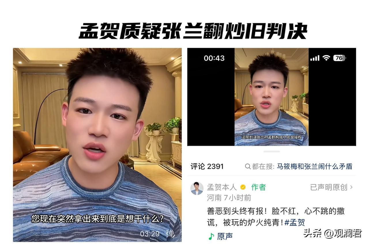 “欺诈性转移财产”的舆论让张兰处在风口浪尖。 4月2号,孟贺发视频质疑张兰翻炒旧判决,疑似拿自己当作舆论挡箭牌,发布视频的账号IP地址显示是河南。 孟贺称,张兰近日在微博晒出的判决书,实为半年前已结案的名誉权相关旧案。他直言,张兰选择此时晒出旧判决,是转移舆论焦点的惯用手法,疑似以自身争议为挡箭牌,掩盖“欺诈性转移财产”的核心话题。 张兰与孟贺本是合作互助的关系,因为经济纠纷结下了怨。后来互为原被告,你告我侵权,我告你诽谤,双方唇枪舌剑,你来我往当宣告,在法庭上多次交锋,历时两年,从法理上双方各有输赢。 结案后本以为双方各自安好,没想到张兰晒出旧判决书的行为,刺激到了孟贺, 孟贺又开始隔空喊话张兰:“你不要主动挑事,我不想成为流量工具,成为你的挡箭牌”。