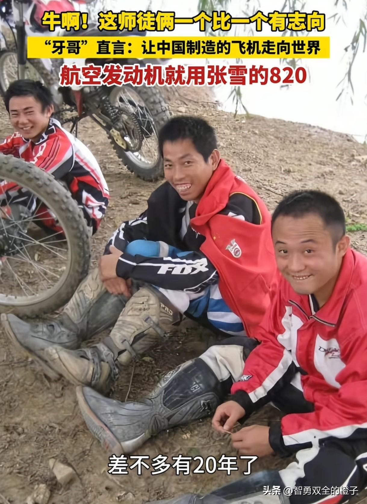 终于知道, 为什么张雪能拿世界冠军了,原来他的师傅牙哥才是真的大佬,一个更牛逼的存在! 牙哥真名张继星,曾经是国内顶尖的摩托车手,拿过多次冠军,也是张雪赛车路上的领路人! 张雪当初拜牙哥为师傅,牙哥不仅分文不取,还管吃管住,一边教他骑车,一边教他修车改车。 两人相处久了,牙哥发现张雪赛车天赋一般,但在改装发动机这块天赋特别强,于是劝张雪:想拿世界冠军不一定要当车手,也可以造能拿冠军的车。 后来张雪听了牙哥的话,揣着2万块到重庆创业,牙哥不仅主动借钱支持他,还动用自己的人脉帮他协调行业资源。 更让人佩服的是,牙哥不仅摩托车玩得厉害,还是个造飞机的大佬,从摩托车领域跨界造飞机,本事是真的大。张雪夺冠后,牙哥说,航空发动机就用张雪机车820rr的发动机。 这么多年一路扶持,才有如今张雪机车闪耀国际赛场,想必牙哥现在也十分欣慰,终究是没看错人。