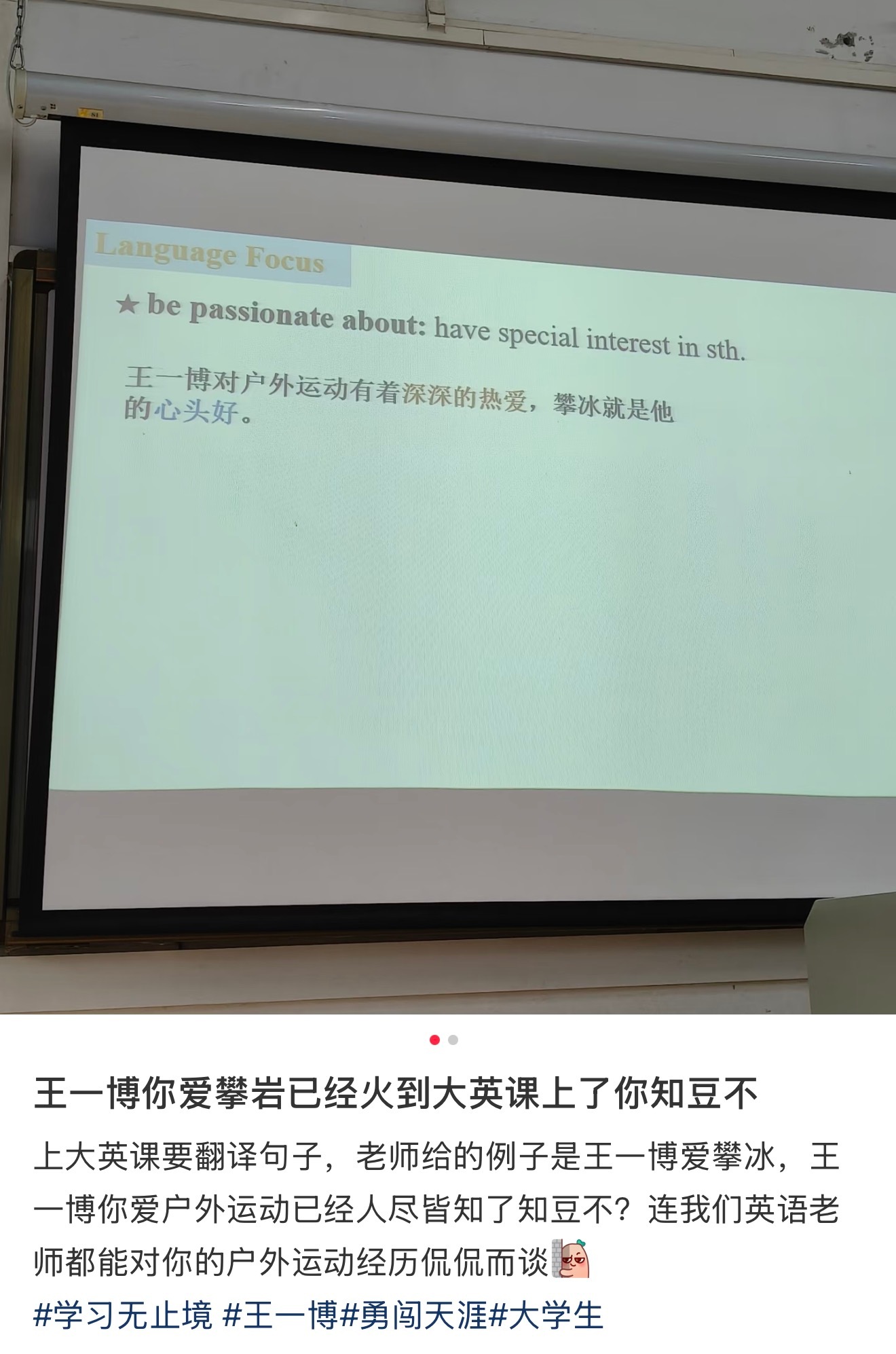 王一博 王一博个人ip标签火到大学英语课上攀冰攀岩一提到就想起一博,个人标签唯一且突出