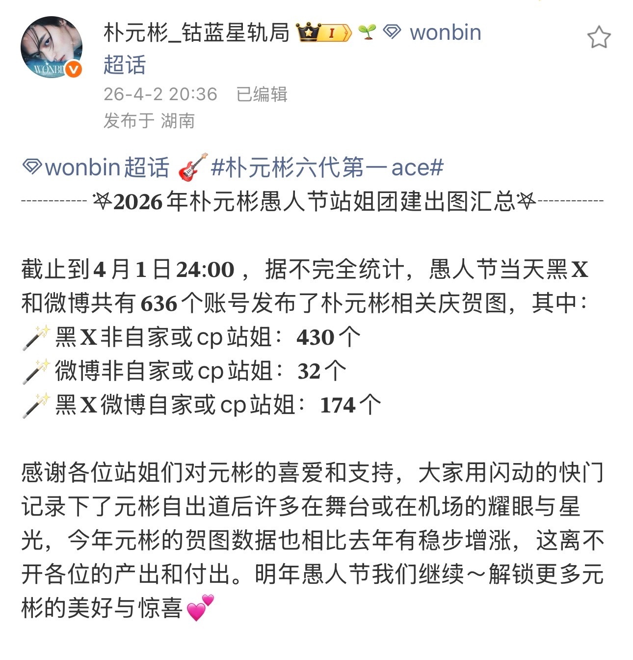这次愚人节站姐团建有462个非自家粉丝发朴元彬贺图 这是在六代人气一骑绝尘的水平吧?不愧是六男一