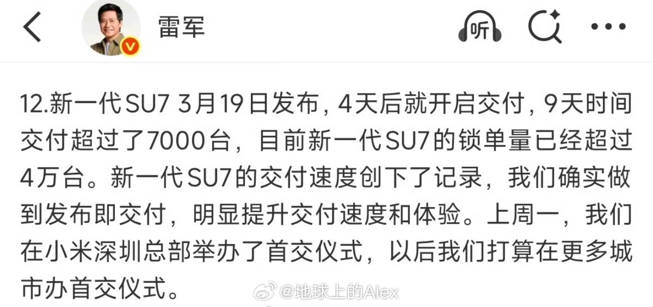 新一代SU7锁单超4万辆这一次新一代小米SU7备货极为充足,交付速度拉满了