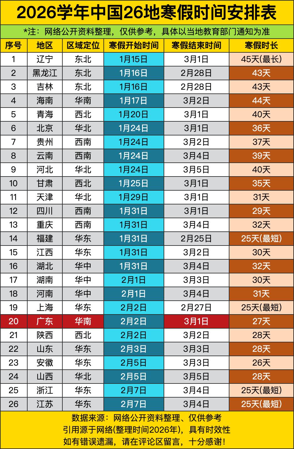 辽宁45天寒假全国最长,黑龙江吉林43天,海南44天。东北人冬天太冷,出门冻掉耳朵,只能窝在家里猫冬。海南人冬天太热,出门晒掉皮,也只能窝在家里吹空调。南北两极,寒假都长,一个冻死,一个热死,都不容易。青海40天,北京36天,贵州37天,云南39天,河北40天,这些地方寒假也不短。 福建25天寒假全国最短,上海25天,浙江25天,江苏25天。长三角包邮区,不仅经济发达,寒假也短。福建人上海人浙江人江苏人,寒假还没放够就开学了,比打工人还惨。福建人哭了:我离东北那么远,寒假却这么短。上海人笑了:我虽然寒假短,但我暑假长啊。其实暑假也短。 广东27天,陕西28天,山东28天,安徽26天,山西28天。这些地方寒假也不长,广东作为华南地区,寒假居然只有27天,比东北少18天。广东人想哭:我冬天不冷,为什么寒假这么短?陕西人更惨,寒假28天,比东北少17天,陕西人想冬眠都不行。 最惨的是江苏浙江上海福建,寒假只有25天,全国垫底。这些地方的学生,寒假还没开始就结束了。江苏人想多放几天假,得去东北。浙江人想多玩几天,得去海南。上海人想多睡几天,得去青海。福建人想多休息几天,得去北京。可惜,他们只能在梦里去。这差距,比寒假天数还大。