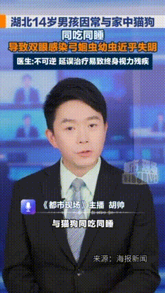 14岁男孩与猫狗同吃同睡,双眼近乎失明,这种伤害终身不可逆! 湖北14岁男孩因常与家中猫狗同吃同睡,双眼感染弓蛔虫幼虫近乎失明,医生:不可逆 14岁的湖北京山男孩小宇(化名),双眼视力已降至右眼0.02.左眼0.1,近乎失明。经检查,他被确诊为眼弓蛔虫感染,眼底已造成不可逆损伤,险些彻底失明。4月1日,极目新闻记者从武汉一家眼科医院获悉,该院及多地眼科门诊均接诊到此类儿童病例。专家提醒,眼弓蛔虫病早期症状隐匿,养宠家庭、卫生条件薄弱的低龄儿童是高发人群,延误治疗可致永久性视力残疾。 谁能想到,朝夕相伴的猫狗,竟会成为毁掉孩子光明的元凶?小宇的悲剧,从来不是个例,而是无数养宠家庭忽视卫生隐患的惨痛缩影。14岁的年纪,本该是趴在书桌前认真读书、在户外肆意奔跑的时光,可小宇却只能模糊地看清眼前的世界,右眼几乎只剩光感,连课本上的字迹、家人的脸庞都难以辨认,这份伤害,是医生口中“不可逆”的定论,是一辈子都无法挽回的遗憾。 小宇的感染,根源就在于长期和猫狗同吃同睡的不良习惯。很多家长觉得,自家宠物干净又温顺,孩子和宠物亲密无间是温馨的画面,却不知道,猫狗身上的弓蛔虫虫卵,会通过毛发、粪便、唾液传播,一旦被孩子误食,就会在体内孵化成幼虫,顺着血液游走,最终侵入眼部。这些微小的幼虫,会在眼底不断破坏视网膜和视神经,引发炎症、玻璃体混浊,最可怕的是,眼弓蛔虫病早期几乎没有明显症状,孩子不会说眼睛疼,也不会主动察觉视力变差,等到家长发现异常,孩子看不清东西时,幼虫早已把眼底啃噬得伤痕累累,再治疗也只能保住残存视力,没法恢复到正常水平。 反观小宇的遭遇,其实完全可以避免。只要家长定期给猫狗做体内外驱虫,不让宠物上桌吃饭、和孩子同床睡觉,督促孩子摸完宠物、玩完沙土后用洗手液彻底洗手,就能切断大部分感染途径。可就是这些看似简单的细节,被很多家庭抛在了脑后,等到悲剧发生,再后悔也来不及了。 孩子的健康,容不得半点侥幸。别让所谓的“爱”,变成伤害孩子的利刃。尤其是家里有低龄儿童的养宠家庭,一定要把宠物卫生和孩子的个人卫生放在首位,别让亲密接触越过安全红线,别让一时的疏忽,毁掉孩子的一生。 各位读者你们怎么看?欢迎在评论区讨论。