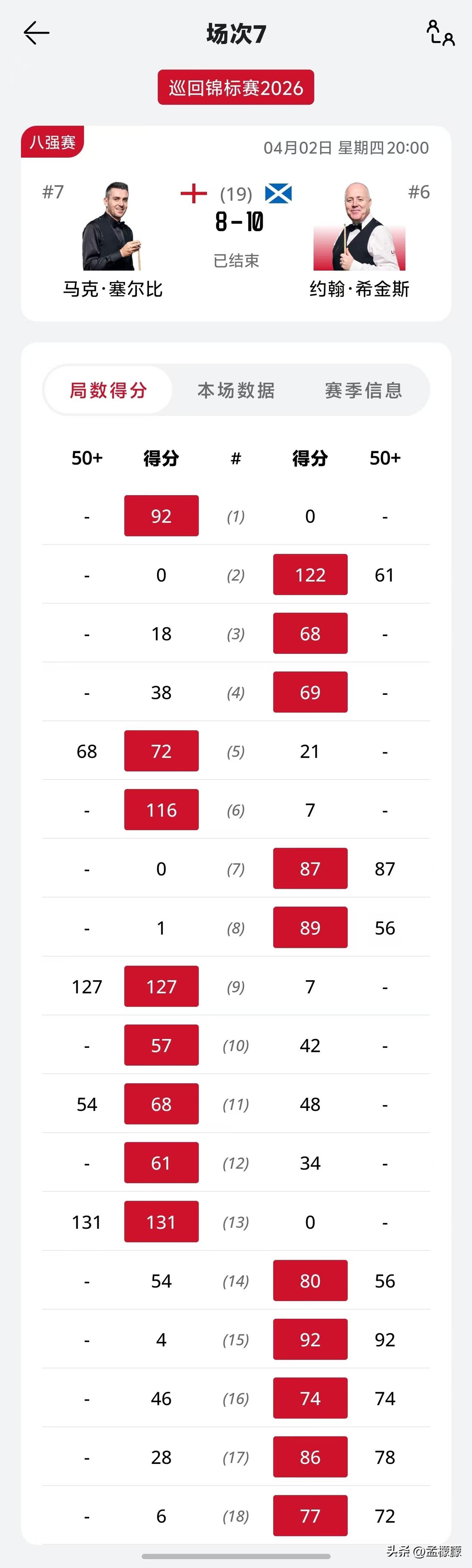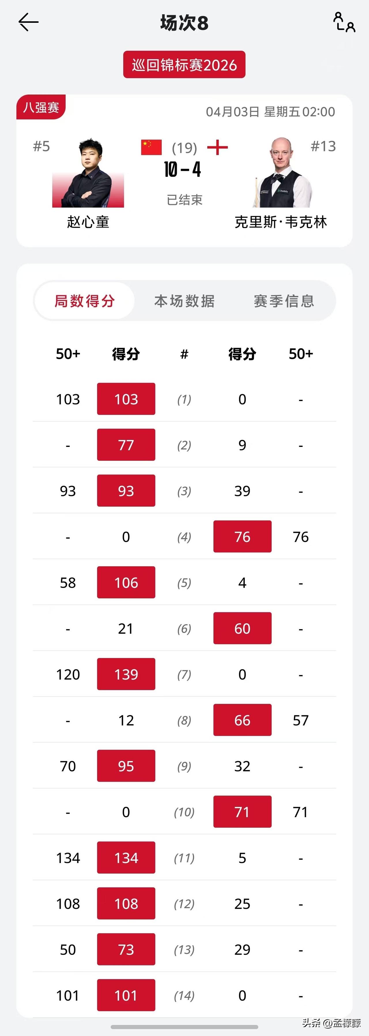 巡回锦标赛|8进4轮次,赵心童10-4战胜韦克林,晋级半决赛对阵希金斯 北京时间4月3日,2026斯诺克 巡回锦标赛8进4轮次的比赛,赵心童 对阵韦克林第二阶段比赛结束,赵心童全面压制韦克林,抓住韦克林的失误,把握机会,6-4后,一波4连鞭,10-4横扫韦克林,晋级四强。 全场比赛,赵心童打出5杆过百(103、120、134、108、101),4杆50+。第一阶段比赛,赵心童5-3领先。 韦克林打出3杆50+。 萝卜10-8霍金斯,希金斯10-8塞尔比,晋级4强。 半决赛对阵:萝卜VS小特,赵心童VS希金斯 一起聊聊斯诺克