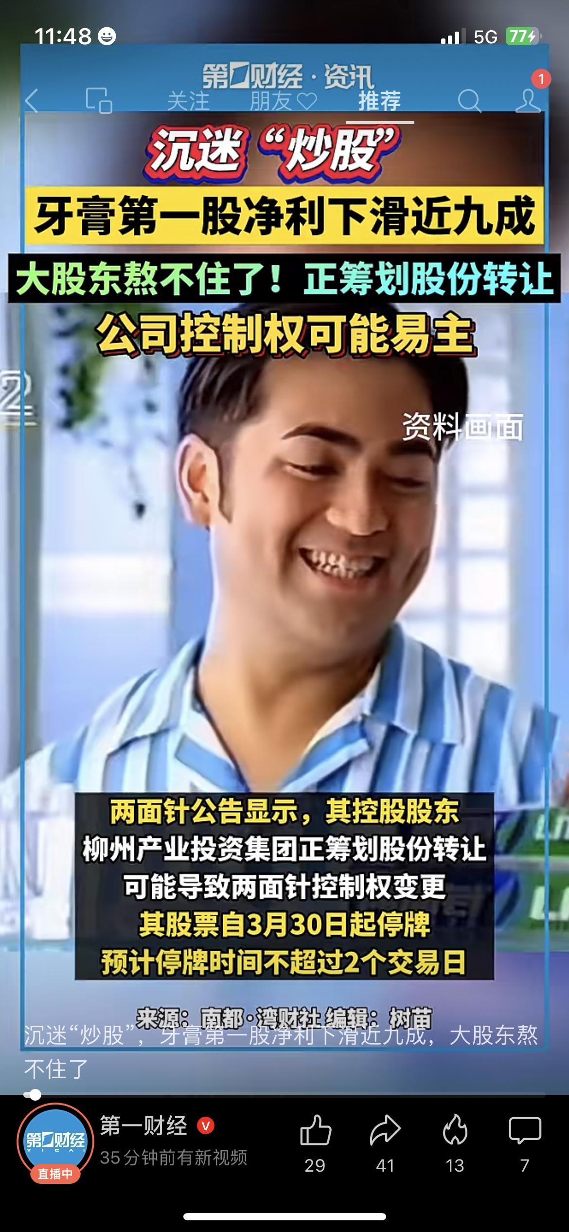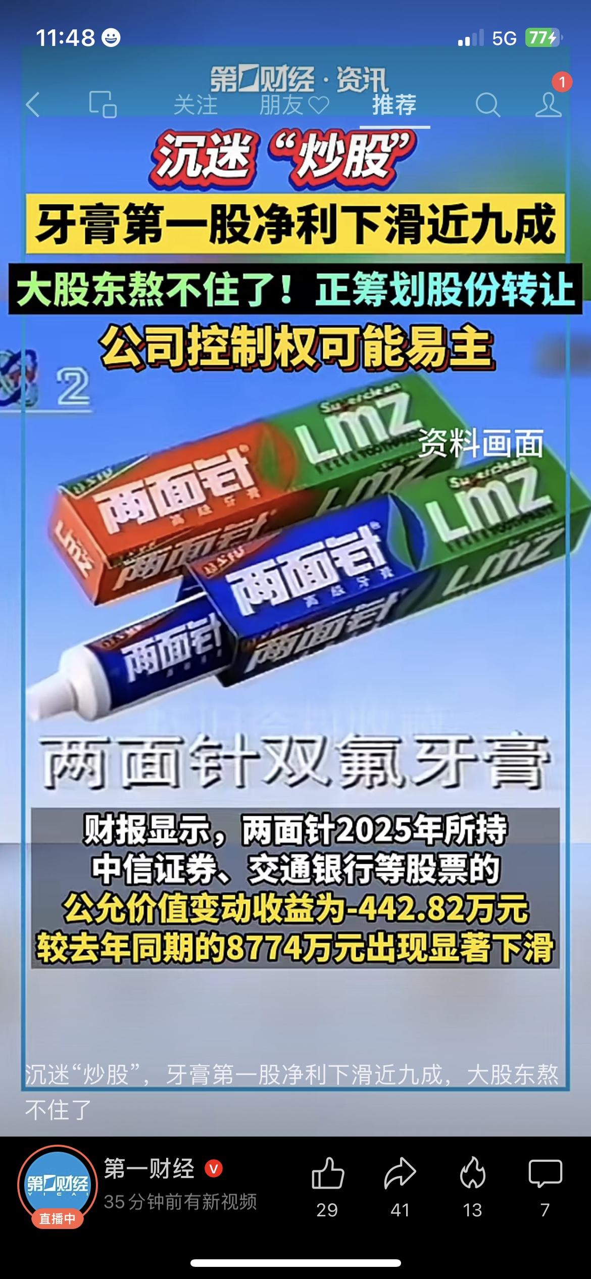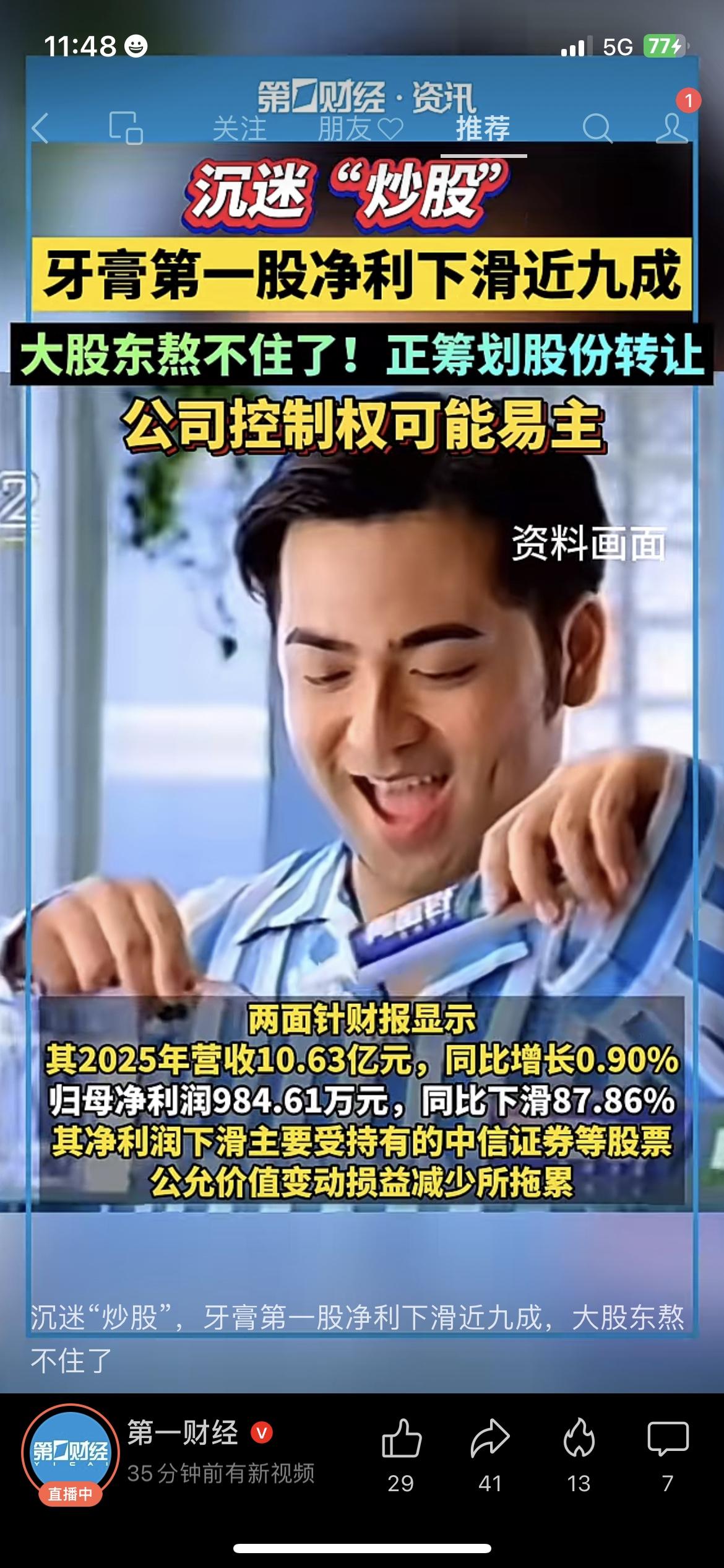 痛心!国民牙膏两面针净利暴跌87.86%,竟因炒股荒废主业! 可惜!国民品牌两面针2025年财报曝光:归母净利润仅984.61万元,同比暴跌87.86%。净利暴跌并非产品滞销,而是公司沉迷股票投资,金融资产亏损数百万,直接拖垮全年利润。 如今大股东筹划股权转让,公司控制权或变更。曾经的国货龙头,因不深耕主业、投机炒股走向没落,实在令人惋惜,也给所有企业敲响警钟:主业才是发展根基! 两面针 国民品牌 上市公司财报 企业经营