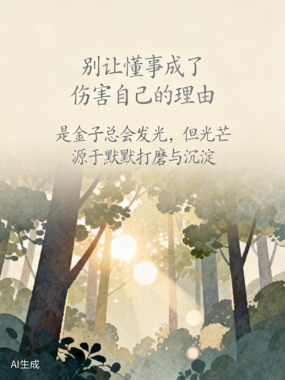 今日有两个感悟,不吐不快。 一是别让懂事成了别人伤害自己的理由。从小被教育要懂事、忍让,我们把需求藏心底,受委屈自己扛,以为这样能换善待。可现实是越懂事越累,越迁就越委屈,因为人性里有得寸进尺。你体谅别人,别人就忽视你;你包容过错,别人就消耗你善良。 二是是金子总会发光,但光芒源于默默打磨与沉淀。先练就过硬实力,有真本事才是根基,再遇伯乐才能出彩。同时要守住健康,深耕自己,时光不会辜负沉淀之人,光芒终会到来。