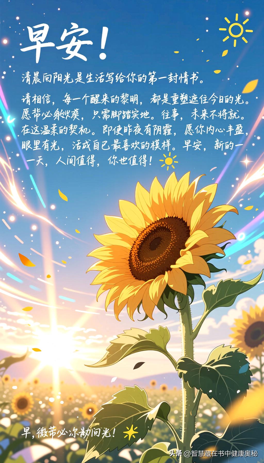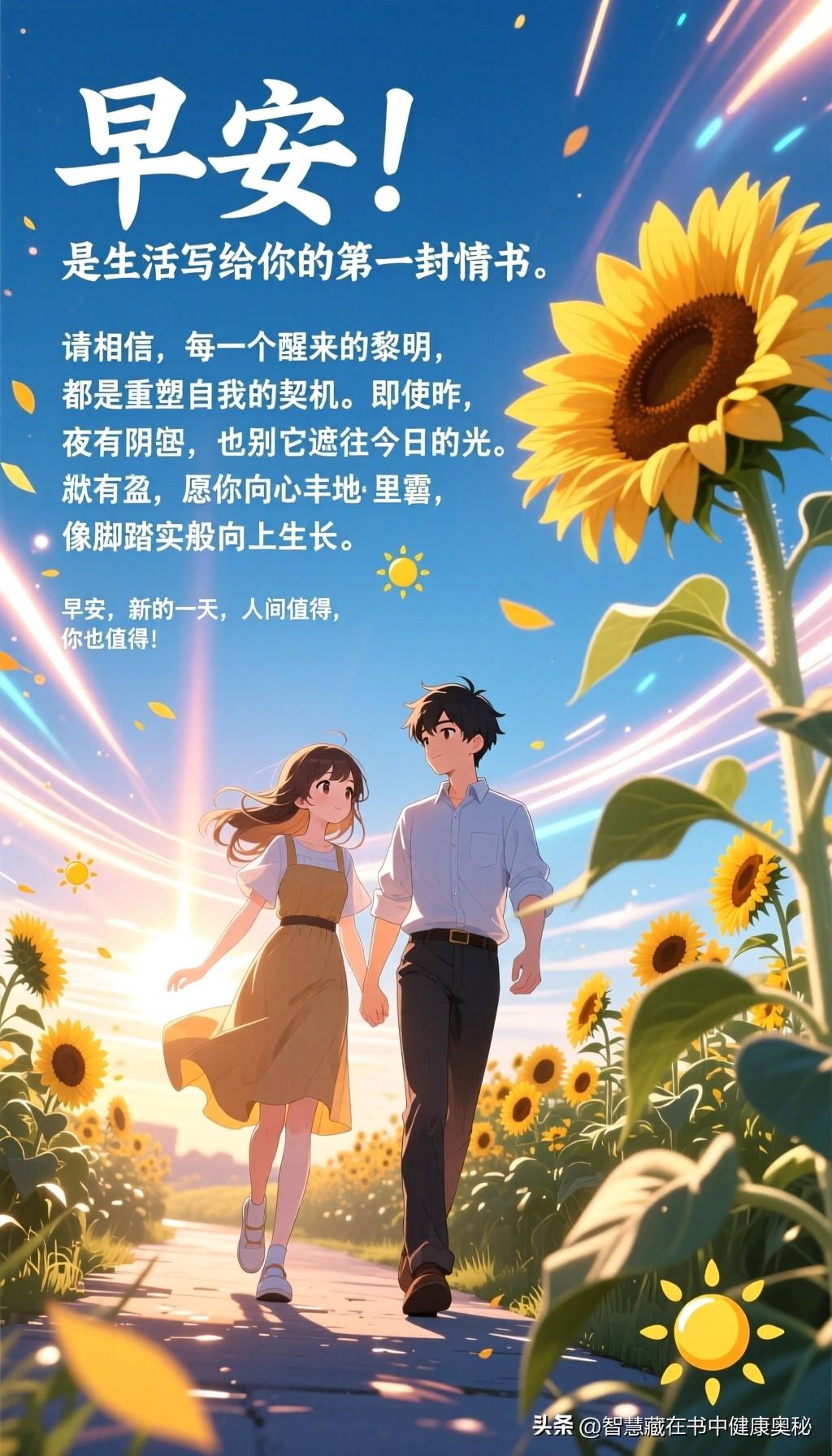 清晨的阳光,是生活写给你的第一封情书。 请相信,每一个醒来的黎明,都是重塑自我的契机。即便昨夜有阴霾,也别让它遮住今日的光。愿你带上微笑,像向日葵般向上生长。 不必步履匆匆,只需脚踏实地。往事不回头,未来不将就。在这温柔的晨光里,愿你内心丰盈,眼里有光,活成自己最喜欢的模样。 早安,新的一天,人间值得,你也值得!✨☀️