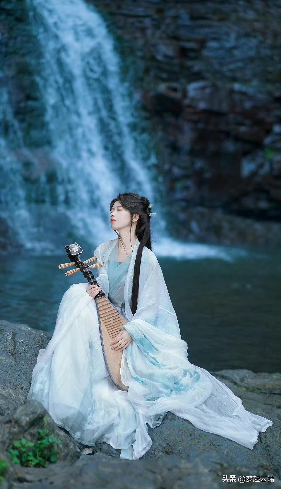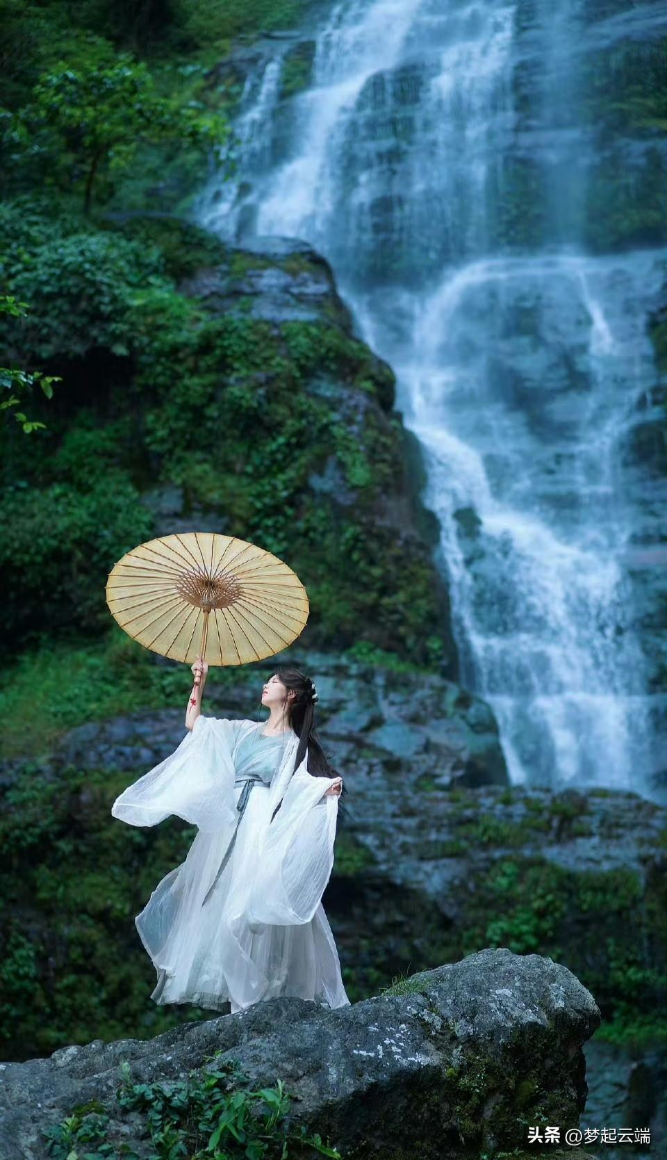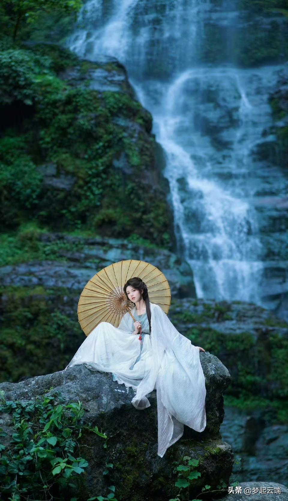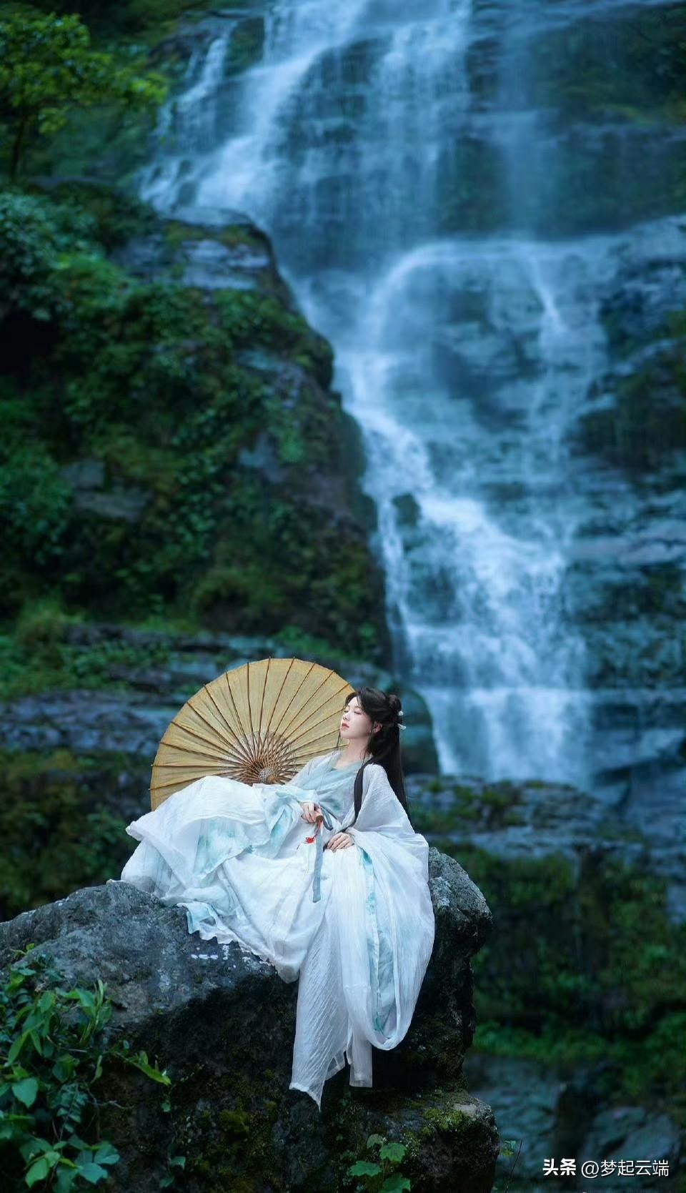 仙气飘飘的汉服少女,倚靠在瀑布旁,感受大自然的宁静与美好。
