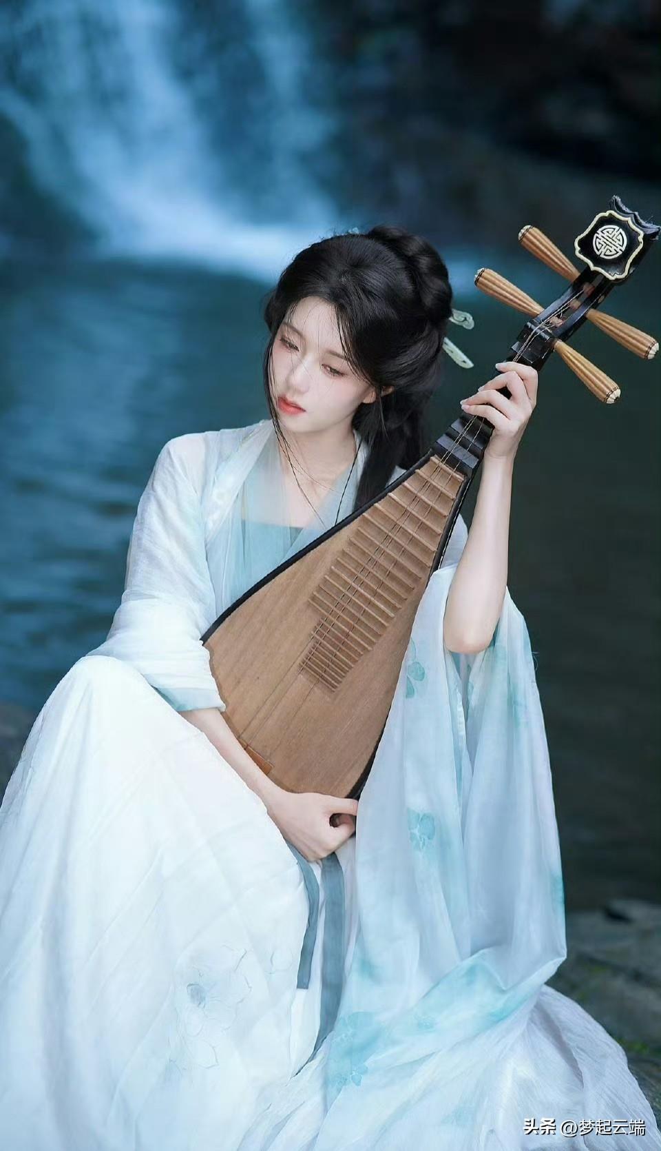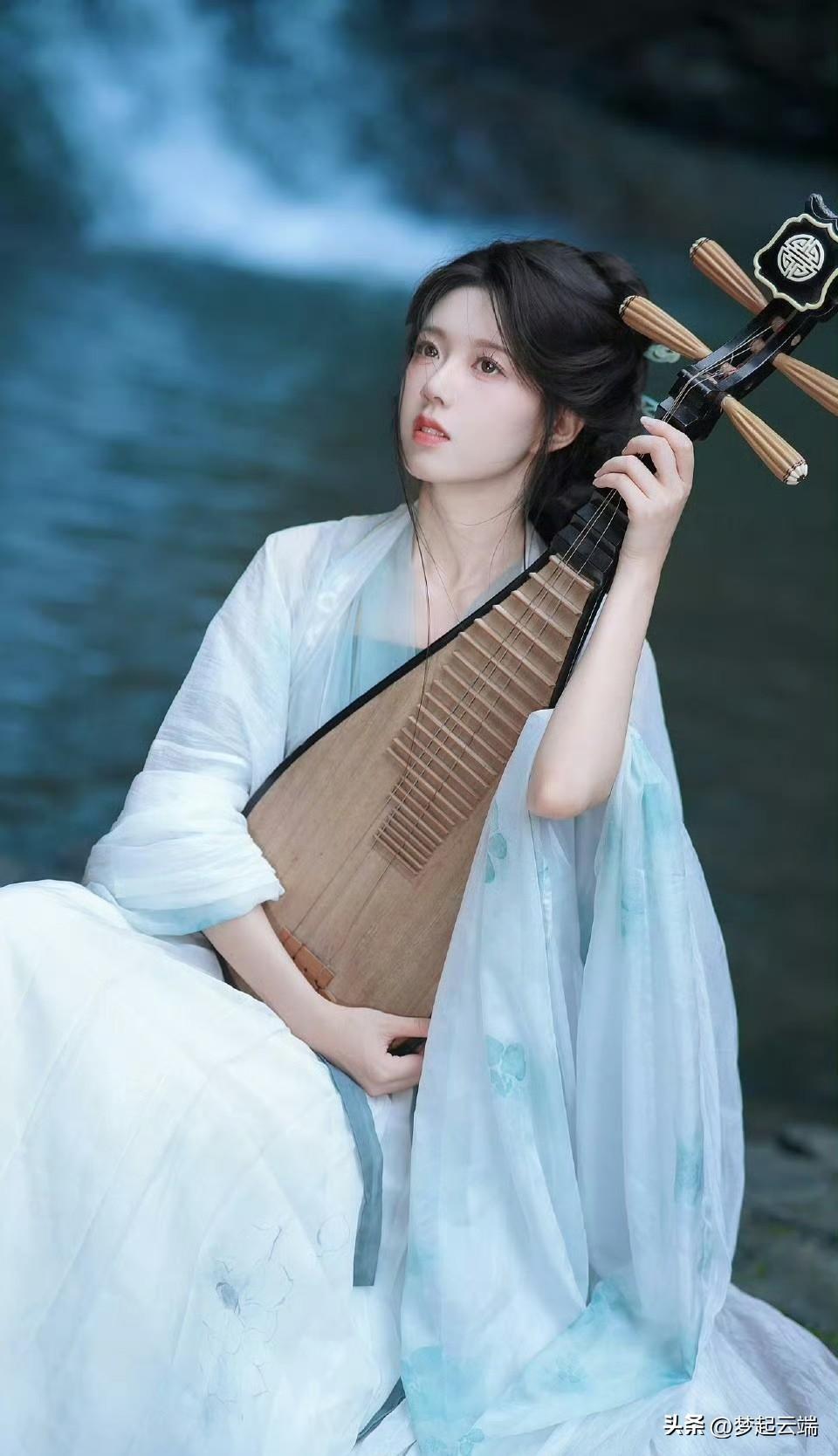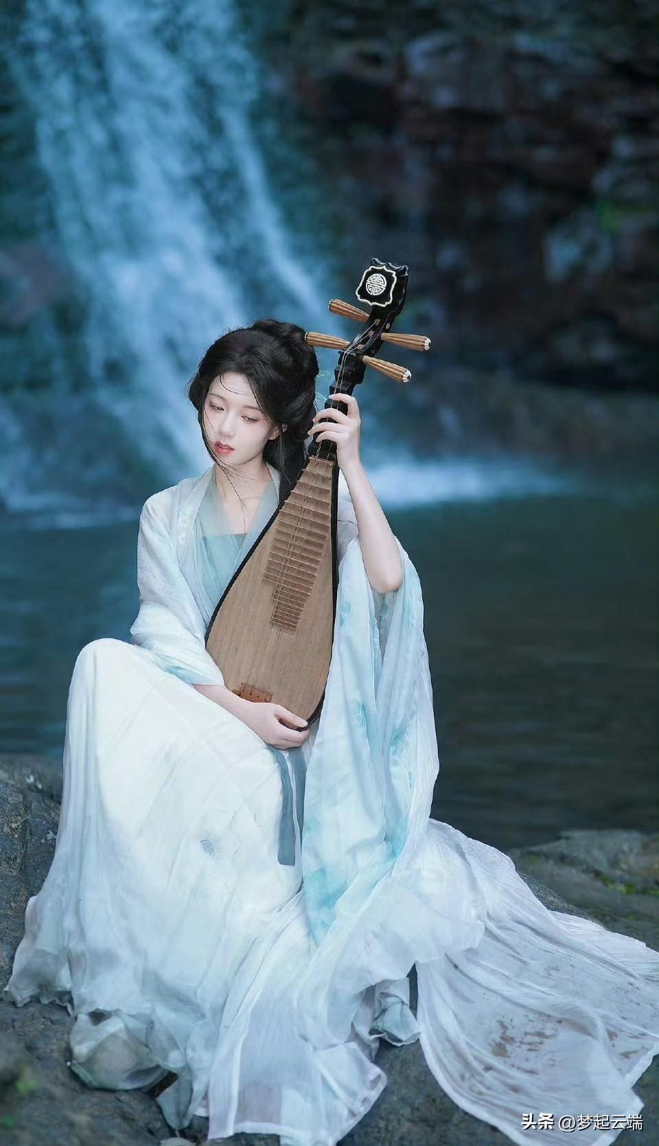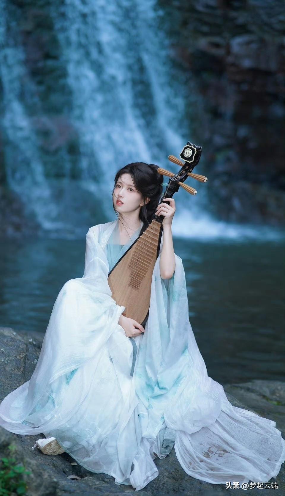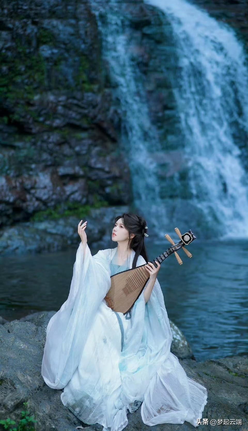 仙气飘飘的汉服少女,倚靠在瀑布旁,感受大自然的宁静与美好。