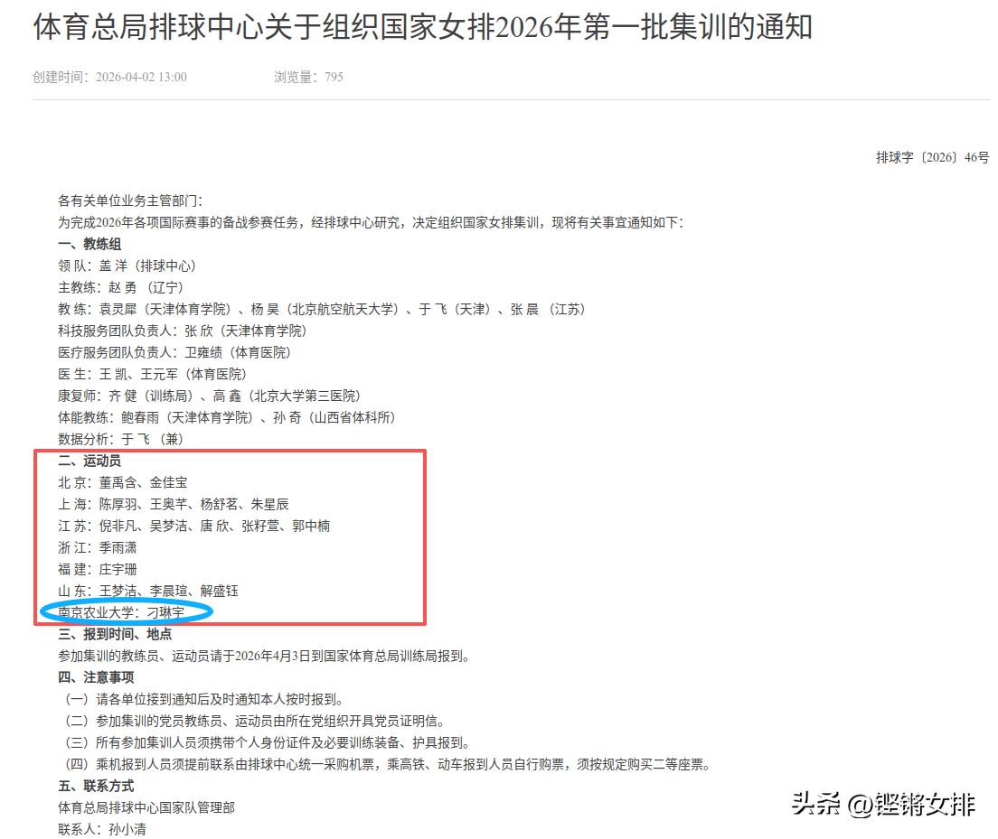 官方快讯:干净清爽的2026年国家队集训,喜大奔普! 4月2日,中国排协紧急发文,要求17名运动员于4月3日到国家体育局报到参加集训!大家喜欢的新生代佼佼者比如李晨煊、季雨潇、金家宝、郭中楠都在队伍里,表现平平的殷小岚已经离开!天津女排0人入选,或许是考虑到天津的队员年龄偏大+伤病困扰+二李事件,李盈莹和王媛媛不在考虑之内! 不得不说,现在的国家队选人用人十分公平公正了,这样干干净净的环境,有利于队伍的成长,中国女排未来可期! 江苏6人入选,其中郭中楠替代万梓玥首次入选!刁琳宇归属单位已经改为南京农业大学,把这个老将召回,真的是众望所归!感谢排协!你们是懂得大众球迷呼声的!! 主攻:5人,吴梦洁,庄雨珊,董雨辰,李晨煊,唐欣 副攻:4人,陈厚宇,王奥千,郭中楠,金家宝 接应:2人,季雨潇,杨舒铭 二传:3人,刁琳宇,张籽萱,解盛钰 自由人:3人,倪非凡,王梦洁,朱星辰 这个配置感觉也是非常合适的!全是实力派+潜力股,坐等队长龚翔宇回来统领!再次感谢排协!明智啊!!