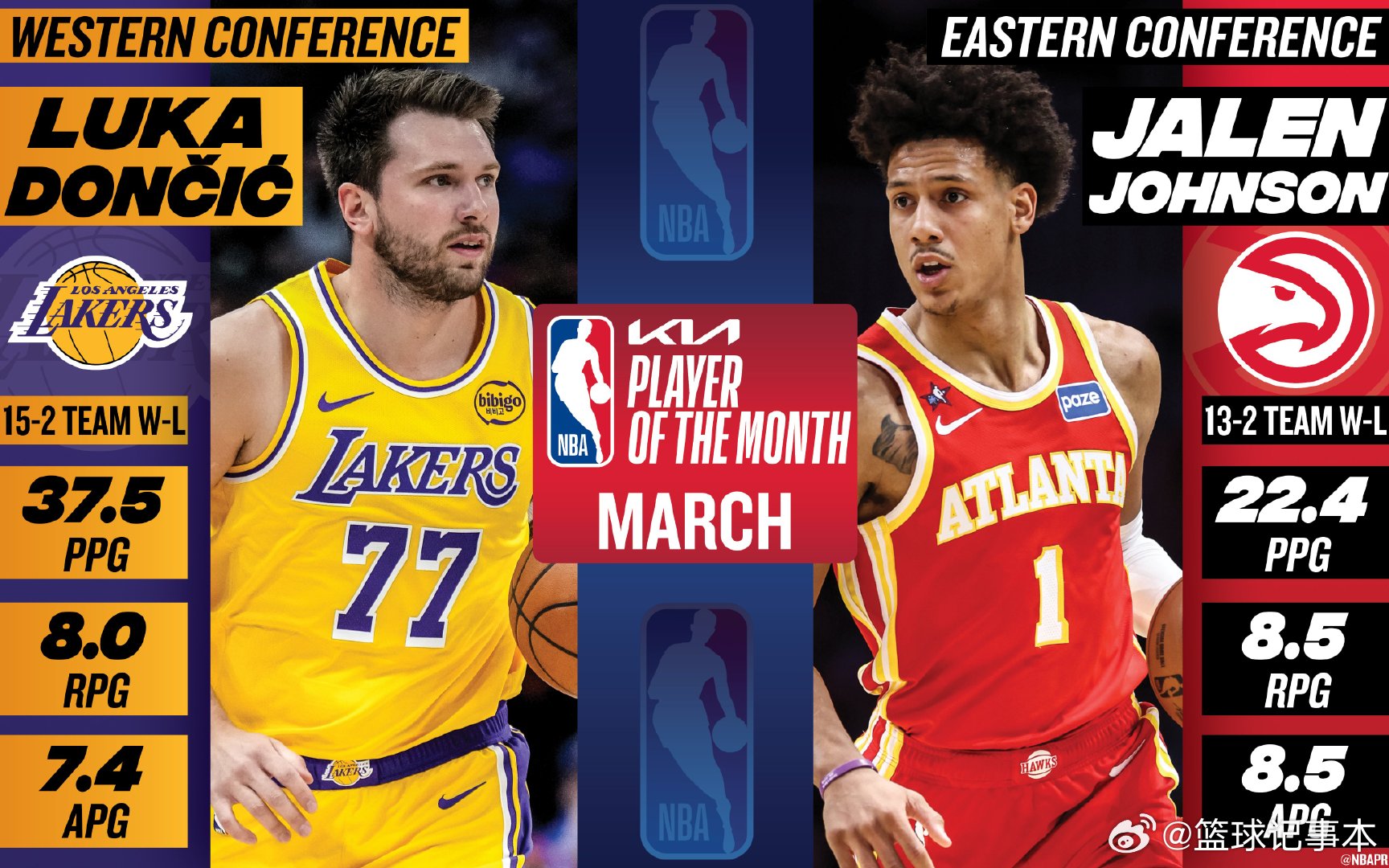 公布三月最佳球员,东契奇与杰伦-约翰逊当选。湖人三月15胜2负,东契奇场均37.5分8篮板7.4助攻;老鹰13胜2负,约翰逊场均22.4分8.5篮板8.5助攻。
