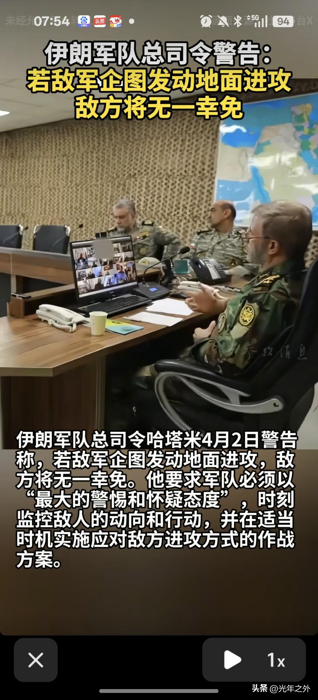 伊朗军队总司令哈塔米4月2日警告称: "若敌军企图发动地面进攻,敌方将无一幸免。" 要求军队以"最大的警惕和怀疑态度",时刻监控敌人动向,适当时机实施应对方案。 另强调:"不能允许某些地方安全,而伊朗人民却处于不安全之中。" 伊朗这狠话,够硬! 哈塔米直接撂底:敢地面进攻,一个活口不留。 不是吓唬人,是把话挑明:你敢踏上伊朗土地,就准备全员埋这。 一边是特朗普喊"速胜",一边伊朗把警惕拉满,眼睛死死盯着美以一举一动。 嘴上说"无一幸免",背后是百万大军、导弹、无人机、地道网全备好。 玩心理战?伊朗不吃这套。 你炸我城市、打我工厂,我就划死线:地面入侵=全歼。 中东这局,越来越凶。 有些国家总以为武力能解决一切,真碰上伊朗这种光脚不怕穿鞋、玩命奉陪的,才知道什么叫踢到铁板。伊朗饱和打击 伊朗命中目标 美军合围伊朗 伊朗领导讲话 伊朗情报人员 伊朗部队 伊朗最高指挥官 伊朗总参谋长