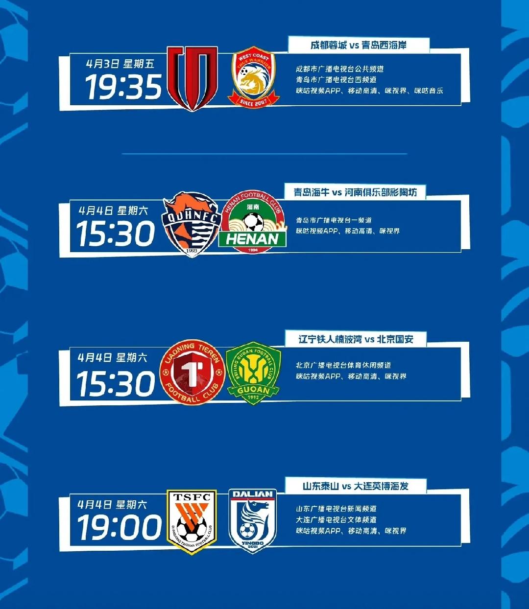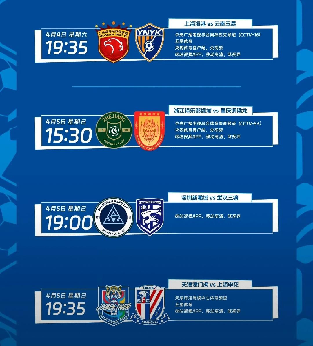中超第四轮联赛转播计划出炉,本轮8场比赛没有绝对的强强对话,但是有几场比赛还是非常值得一看,海牛主场踢河南,三轮不胜的海牛能不能拿到新赛季的第一个积分,辽宁铁人主场踢国安,铁人能不能延续胜利,上轮惨败的泰山主场踢大连,能不能走出失利的阴影收获胜利,卫冕冠军海港上轮输大连,本轮比赛主场踢状态正佳的云南玉昆,能不能主场获胜,本轮最后一场比赛也是最受关注的比赛无疑是天津津门虎主场踢上海申花,状态拉胯的天津津门虎面对状态不错的申花,能否完成触底反弹,看看本轮8场比赛会上演怎样精彩的剧情!