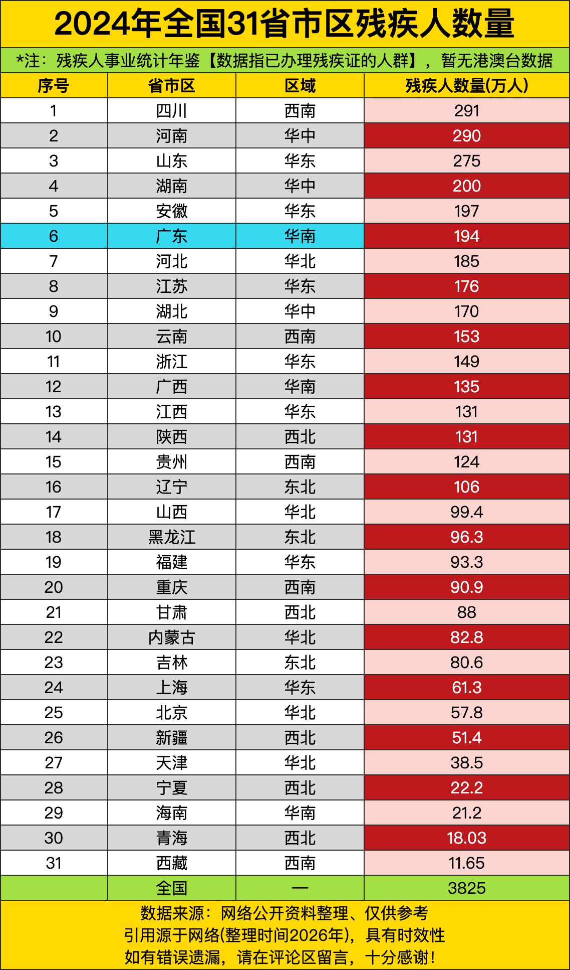 四川291万残疾人,全国第一,河南290万第二,山东275万第三。四川人不仅爱吃火锅,还爱生病?河南人不仅爱生孩子,还爱残疾?山东人不仅爱考公,还爱受伤?其实不是,是人口基数大,残疾人自然多。四川河南山东,都是人口大省,残疾人数量自然靠前。湖南200万,安徽197万,广东194万,河北185万,这些省份也不少。 江苏176万,湖北170万,云南153万,浙江149万,广西135万。这些省份残疾人也不少,江苏作为经济大省,残疾人也不少,看来有钱也挡不住残疾。湖北作为中部中心,残疾人也不少,看来九省通衢也不安全。云南作为旅游大省,残疾人也不少,看来高原反应也能致残。浙江作为富裕省份,残疾人也不少,看来有钱人也生病。 西藏11.65万,全国最少,青海18万,宁夏22万,海南21万,天津38万。这些省份残疾人少,是因为人口少,还是因为环境好?西藏高原,空气稀薄,残疾人反而少,奇怪。青海地广人稀,残疾人少,正常。宁夏沙漠多,残疾人少,也不奇怪。海南阳光好,残疾人少,可能是晒太阳补钙。天津直辖市,人口少,残疾人少。 最惨的是四川,残疾人最多,但四川人乐观,地震都打不倒,残疾也不怕。河南第二,河南人坚强,洪水都冲不垮,残疾也不怕。山东第三,山东人豪爽,车祸也不怕,残疾也不怕。这些省份的残疾人,虽然身体残疾,但精神不残疾,值得尊敬。其他省份的残疾人,也要自强不息,活出精彩。这差距,不是残疾人数量的差距,是精神的差距。