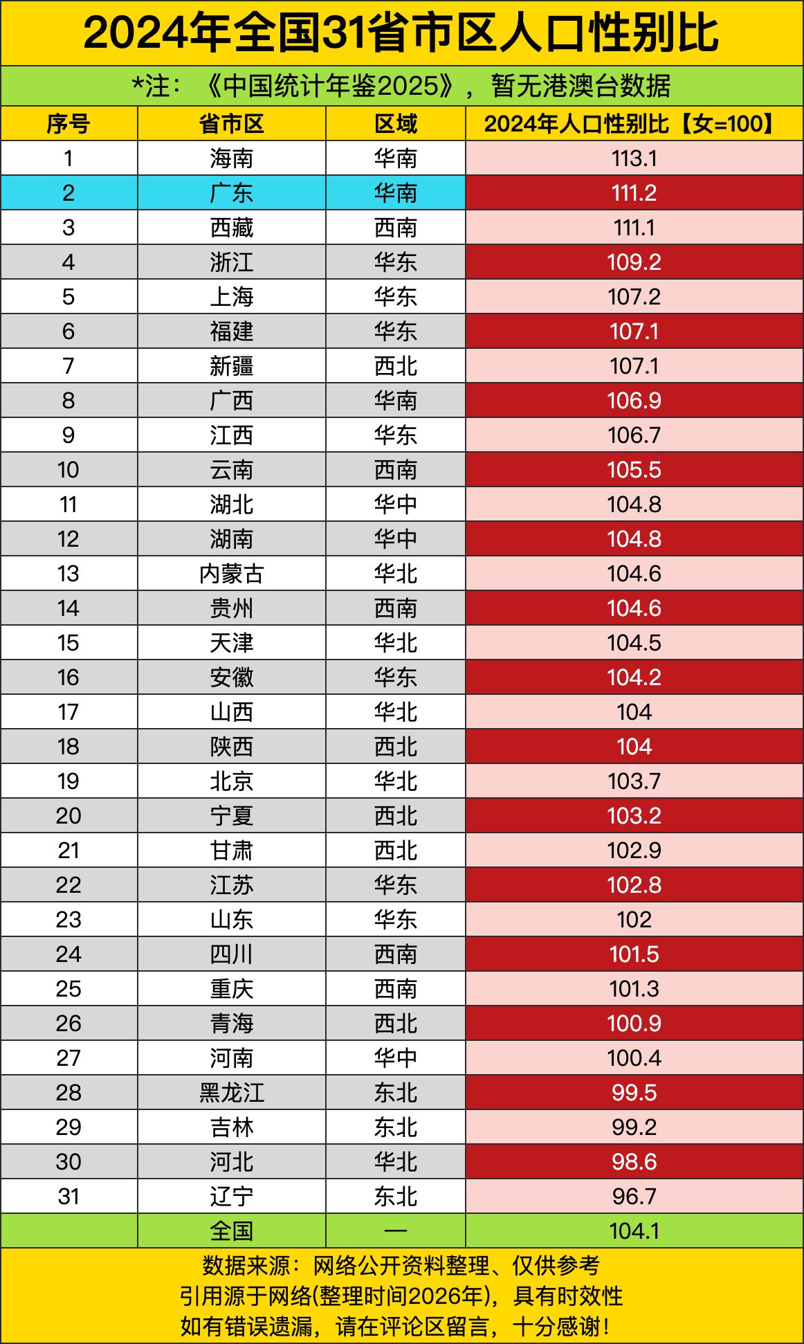 海南性别比113.1,全国最高,每100个女人对应113个男人。海南男人多,是因为女人少,还是因为男人都去海南养老了?广东111.2第二,每100个女人对应111个男人。广东男人多,是因为工厂招男工多,还是因为重男轻女?西藏111.1第三,高原反应,女人都跑了吧。 浙江109.2第四,上海107.2第五,福建107.1第六,新疆107.1第七,广西106.9第八,江西106.7第九。这些省份性别比都超过106,男人明显多于女人。浙江上海福建,经济发达,男人多是因为外来务工人员多。新疆广西江西,男人多是因为重男轻女?还是因为女人外嫁了? 辽宁性别比96.7,全国最低,每100个女人对应96.7个男人。辽宁女人多,是因为男人都外出了,还是因为女人寿命长?河北98.6,黑龙江99.5,吉林99.2,东北三省性别比都低于100,女人比男人多。东北女人多,是因为男人都去南方打工了,还是因为东北女人更愿意留下来? 河南100.4,青海100.9,四川101.5,重庆101.3,这些省份性别比接近100,男女基本平衡。河南作为人口大省,男女比例居然最平衡,河南人真会生。青海作为西部省份,男女比例也平衡,青海人也不重男轻女。四川重庆作为西南省份,男女比例也平衡,川渝男人怕老婆,女人当家做主。