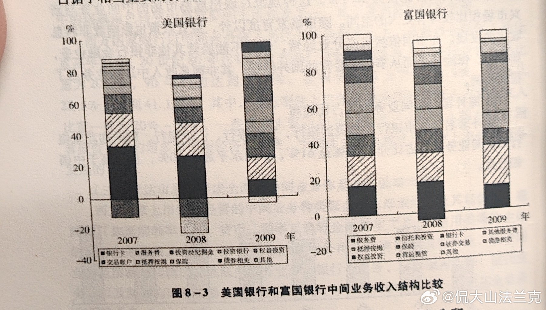 1.海外银行中间业务收人占比较高海外著名的上市银行,如美国银行、富国银行、汇丰银行、RBS和花旗银行的中间业务收人占比介于39%至61%,平均水平超过50%,显著高于中国银行业。 美国银行和富国银行2009年的中间业务收人结构来看,美国银行的投资经纪、交易账户、投资银行和服务费等收人占比达到56%。富国银行则更加丰富,主要中间业务来源包括服务费(14%)、信托和投资(23%)、银行卡(9%)、其他服务费(9%)、抵押按揭(28%)、营运租赁(2%)、保险(5%)、证券交易(6%)和其他(4%)。分析这两家银行的中间业务可以发现,新兴增值服务收入(包括账户管理费、信托、投资、经纪、 投资银行等)和多元化经营带来的中间业务收入(如保险、营运租赁等)均占据了相当重要的份额。