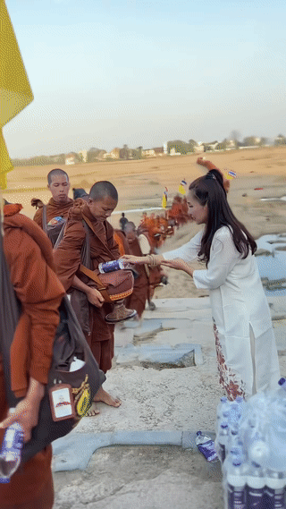 泰国🇹🇭一位善良的年轻美女站在路边免费给一队正在进行徒步苦行的僧团免费发放纯净水。 泰国是典型的佛教国家,那里的人绝大部分都是信佛的。 虽然他们信奉的是南传小乘佛教,但是他们对佛的虔诚真是令人动容。