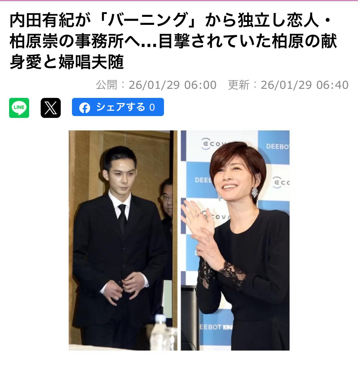 演员内田有纪(50岁)于3日通过个人官网宣布,与同为演员出身、现担任其经纪人的柏原崇(49)登记结婚。 1月就传出内田独立出来去了柏原的事务所。两人妇唱夫随。 内田两人作为伴侣共同走过了漫长的公私岁月,如今将以家人的身份迈出新的一步。 以下为声明全文: “致一直以来支持我们的各位及相关人士: 衷心感谢大家此次给予的众多温暖祝福。 正如部分媒体报道,柏原崇与内田有纪已正式登记结婚。 以这样的形式向各位报告,恳请理解。 我们共同走过的时光,如今以‘家人’的形式得以延续。 今后二人也将携手并肩,珍惜温情,认真度过每一天。 若能继续温暖守护,我们将深感欣喜。 今后也请多多关照。 柏原崇 内田有纪” 鉴于两人长期在公私领域共同相伴,其关系此前已通过媒体等渠道有所披露,故未再特意另行报告。