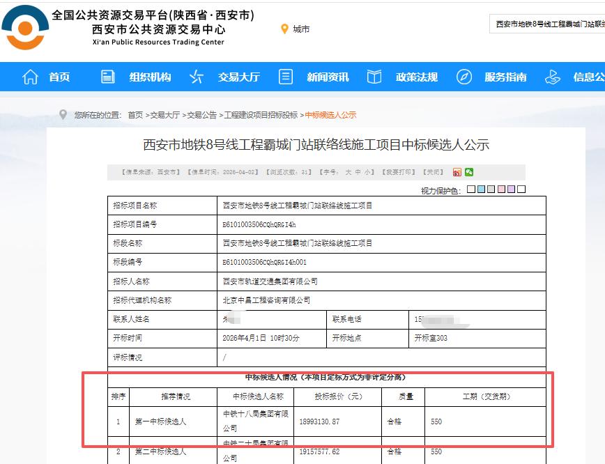 报价1899万!中铁十八局拟中标西安市地铁8号线工程霸城门站联络线施工... 日前,西安公共资源交易中心发布《西安市地铁8号线工程霸城门站联络线施工项目中标候选人公示》,内容显示: 西安市地铁8号线工程霸城门站联络线施工项目,招标人为西安市轨道交通集团有限公司;第一中标候选人为中铁十八局集团有限公司,投标报价18993130.87元。 据悉,西安市地铁8号环线全长49.896公里,设车站37座(其中换乘站18座),设车辆段及停车场各一座,控制中心1处,备用控制中心1处,新建主变电所1座,与其他线路共用主变电所3座;项目投资总额:484.388亿元。 本次招标的西安市地铁8号线工程霸城门站联络线施工项目,主要承担西安市地铁8号线工程霸城门站联络线土建(含前期工程)施工任务,具体内容详见招标文件(本标段招标估算2000万元)。联络线总长约72.1m,为地下二层明挖结构(局部暗挖)。 本次拟中标的中铁十八局集团有限公司是世界500强——中国铁建的旗舰企业,集团公司总部驻地天津市,注册资本金30亿元,前身是中国人民解放军铁道兵第八师,组建于1958年,2008年随中国铁建整体上市。集团公司是全国唯一一家“五特六甲”建筑法人企业、天津市建筑行业首位企业,综合实力位居中国铁建“第一方阵”,连续多年获得中国铁建经营业绩考核A类。 未来,随着联络线工程的顺利施工,将进一步完善西安地铁8号线的配套功能,加速轨交线网融合,为市民提供更便捷、高效的出行服务,同时助力西安“轨道上的都市圈”建设提质增效,为城市高质量发展注入新动能。