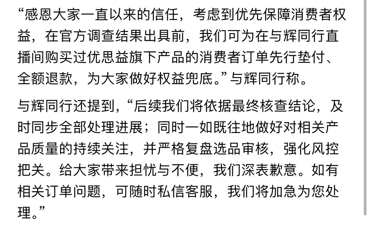 与辉同行开始道歉,并且表示将自掏腰包先给顾客进行退款。不过这一次大家更看重的就是赔偿问题的,毕竟按照消费者权益法,你虚假宣传售卖假的产品,是应该退一赔十的。所以这一次不仅仅要退款,更应该给消费者进行赔偿。 就是不知道后面与辉同行不会回应赔偿一事。如果这一次愿意自掏腰包给顾客进行赔偿的话,那么也能收获一个好的名声。 当然从这件事也看得出来,有的时候厂家造假,作为那些带货的人也没有办法。这一次的话,大家也是不怪董宇辉的。