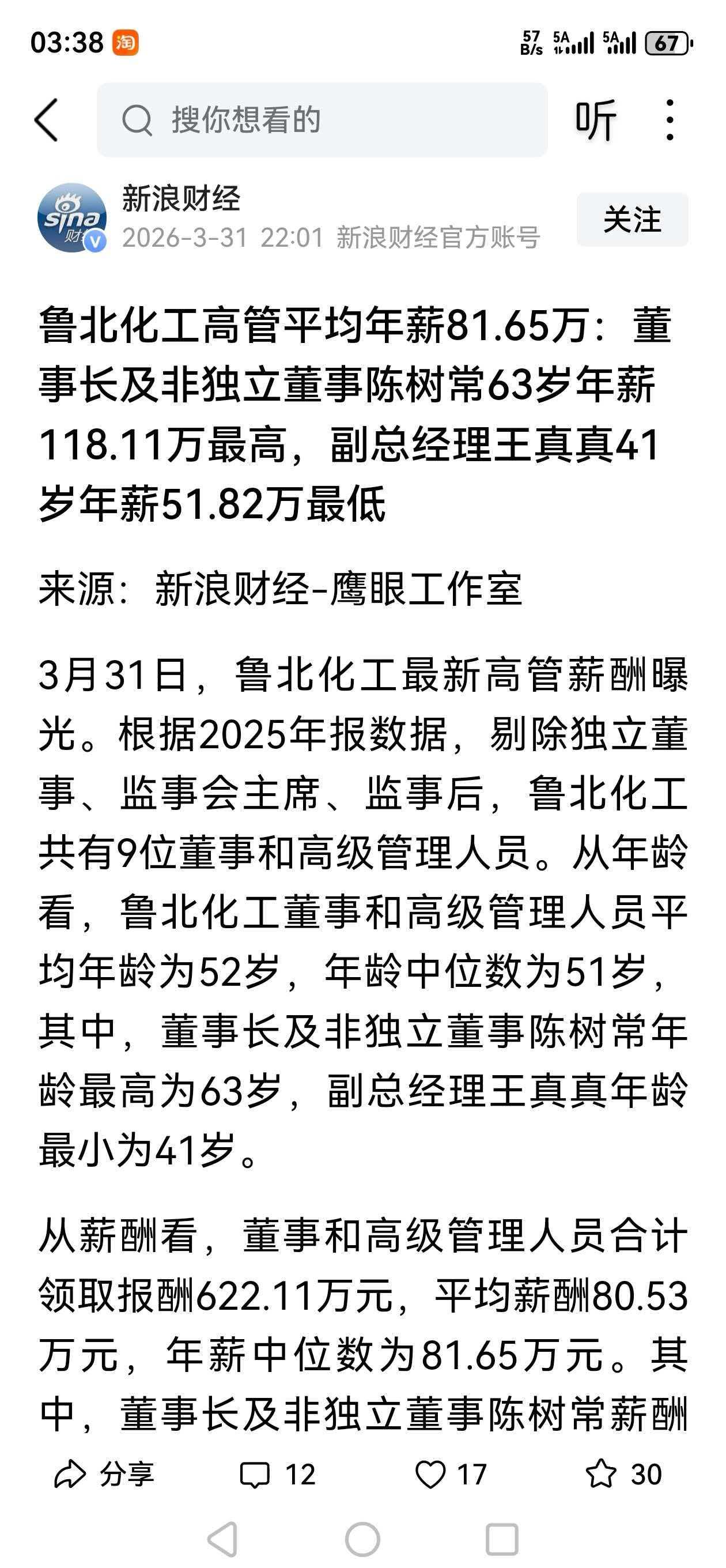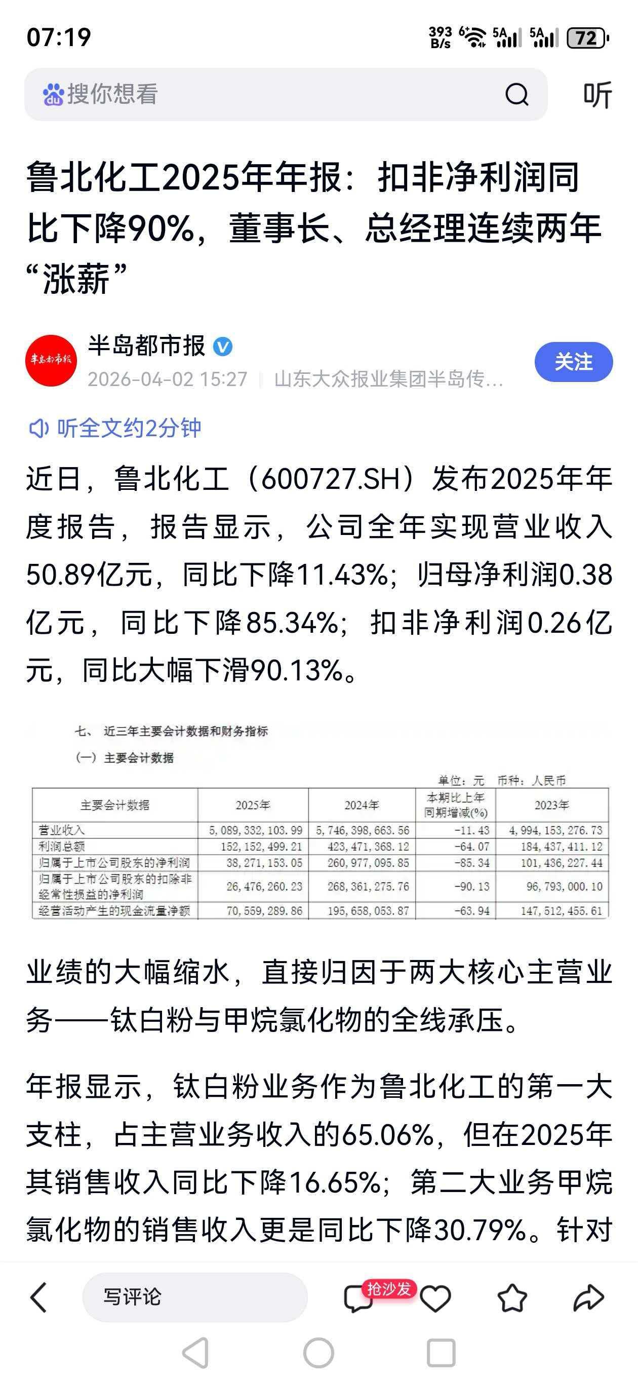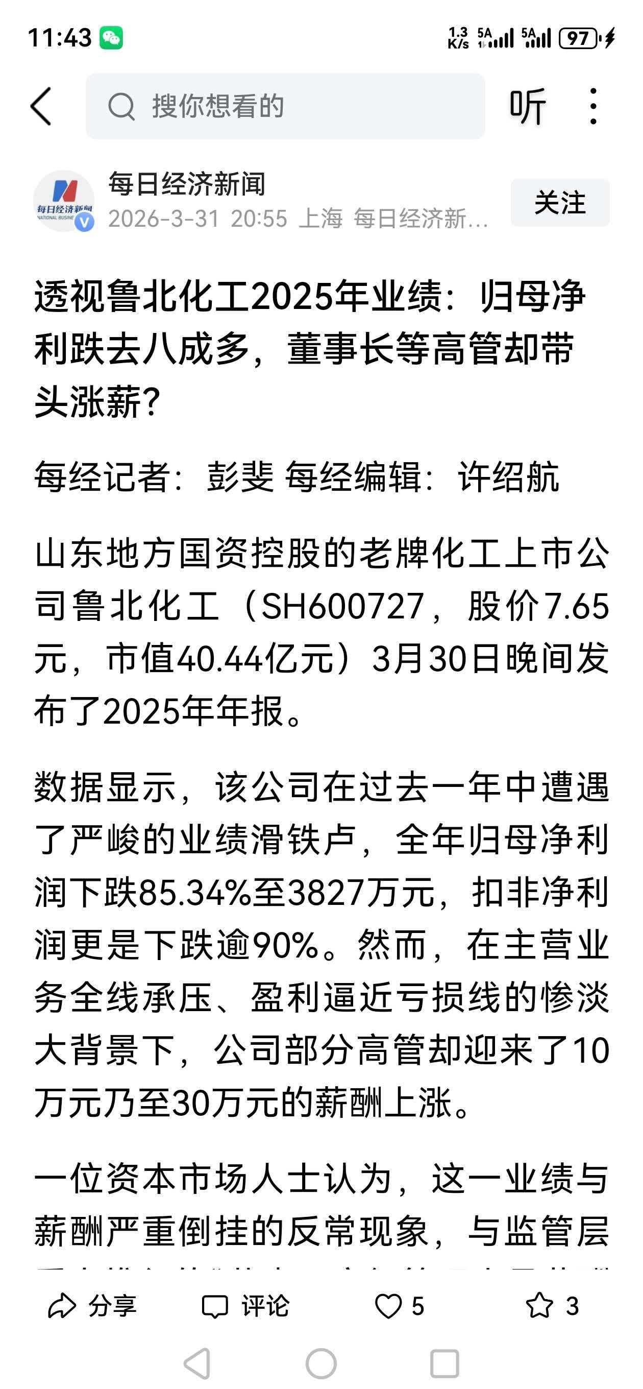 对于山东滨州第一家上市公司——鲁北化工,业绩倒挂下部分高管仍逆势涨薪事件,咨询了一下豆包,做出如下评论。 题目: 国企薪酬改革当有更实标尺 鲁北化工净利暴跌超八成,高管薪酬却逆势上涨,这一事件戳中了国企薪酬制度的痛点。 作为地方国资控股企业,其薪酬设定本应紧扣业绩导向与社会责任双重标尺。当企业利润大幅缩水,高管薪酬非但未随之下调,反而出现个别岗位超60%的涨幅,既违背了证监会关于董监高薪酬与业绩匹配的监管要求,也难以向投资者和公众交代。 公司以“工作量、考核表现”作为解释,但未公开具体考核细则,这种模糊化的说辞,消解了薪酬考核的公信力。国企的特殊属性决定了其不能单纯以市场化借口“旱涝保收”,薪酬制度更应做到权责利对等,将考核指标量化公开,让薪酬涨跌真正与企业效益、股东回报挂钩。 此次鲁北化工的争议,也是对所有国企的一次提醒:薪酬改革不能流于形式,唯有建立更透明、更刚性的业绩绑定机制,才能让薪酬真正成为激励而非诟病的焦点。 来源 相关资料综合每日经济新闻 新浪财经 半岛都市报等(见下图)