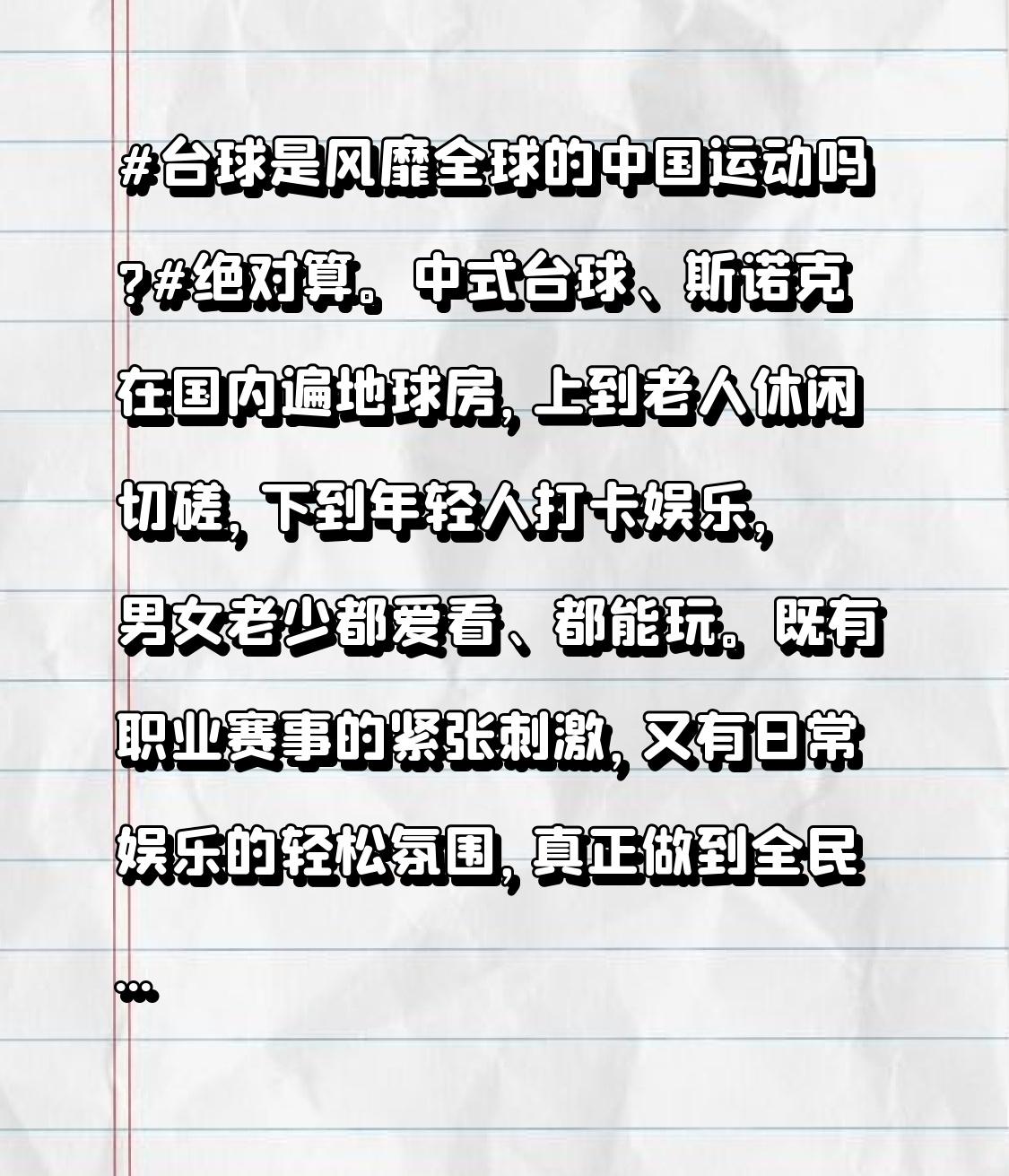 台球是风靡全球的中国运动吗? 绝对算。中式台球、斯诺克在国内遍地球房,上到老人休闲切磋,下到年轻人打卡娱乐,男女老少都爱看、都能玩。 既有职业赛事的紧张刺激,又有日常娱乐的轻松氛围,真正做到全民皆宜、风靡大街小巷。