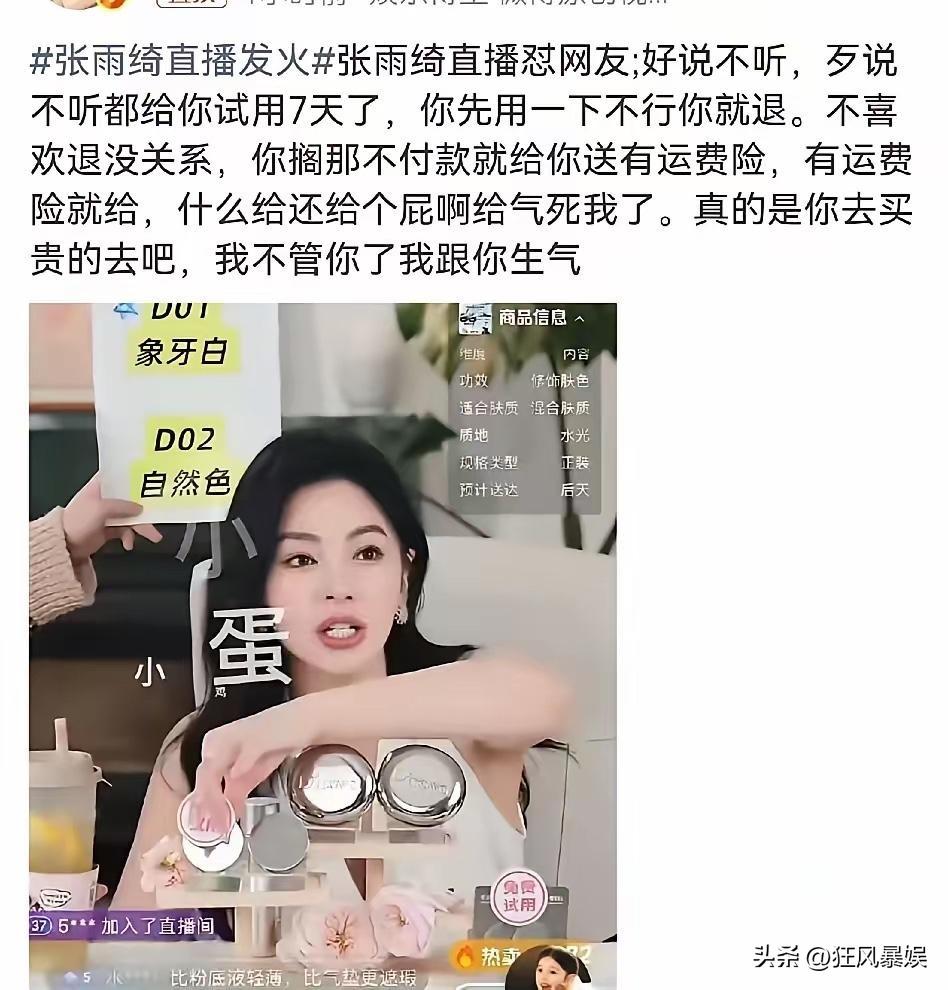 张雨绮,脾气真大! 4月2日,张雨绮在直播中为了一款99元的美妆产品当场发火。 事情经过是这样的:她反复劝说了15分钟,强调“7天无理由试用,有运费险,没需求别占库存,大家互相体谅”。但弹幕根本不听,满屏飘着“靠谱吗”“会不会卡粉”,甚至有人直接说“反正有运费险,不付款白试试呗”。 这句话彻底点燃了张雨绮。 她拍着桌子说:“好说不听,歹说不听!你搁那不付款就给你送?给什么给,给个屁啊!气死我了。你去买贵的去吧,我不管你了我跟你生气!” 结果可想而知——直播间18.6万人,瞬间跑了三分之一。 有人说她真性情、不装;也有人觉得作为主播,对消费者发火实在不妥。但换个角度想:忍了15分钟才爆发,换作是你,能忍更久吗?