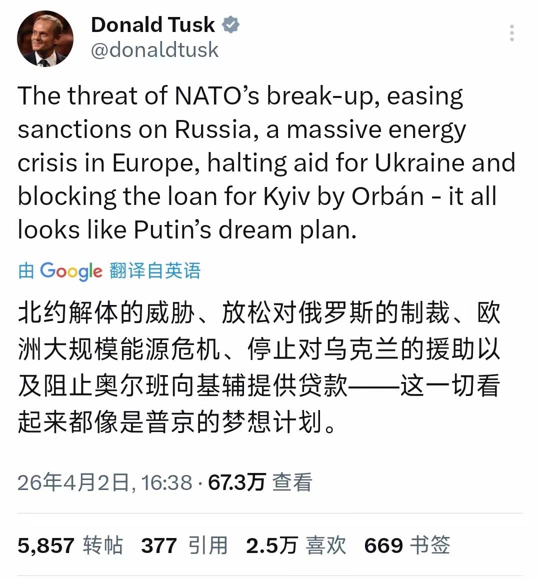 波兰总理图斯克:“北约解体的威胁、放松对俄罗斯的制裁、欧洲遭遇大规模能源危机、停止对乌克兰援助,还有奥尔班阻止向基辅提供贷款——这一切似乎都是普京心中的理想计划。” 笑死我了!波兰人啊,你们要是胆子再大些,直接点明背后的大老板是美国不就把问题挑明了嘛!什么北约解体、放松对俄制裁、欧洲遭遇大规模能源危机之类的,不都是美国人的所作所为导致的嘛!