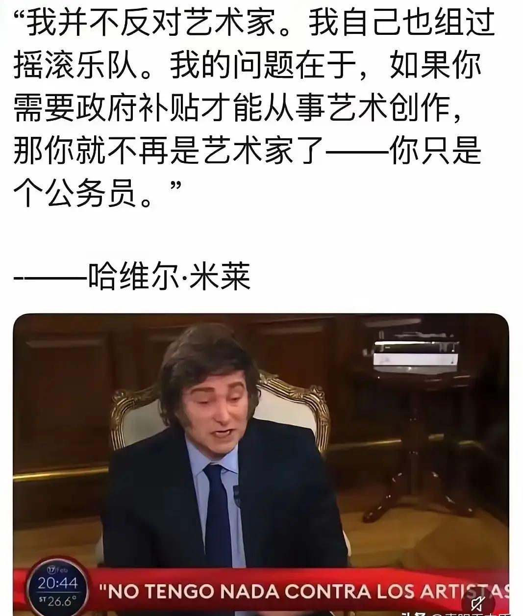 阿根廷总统哈维尔·米莱,作为一个艺人出身的总统。 个人以为,他对“艺术家”的理解尤为深刻! 不知道有些所谓的“艺术家”们看到米莱的观点后是否会羞愧?