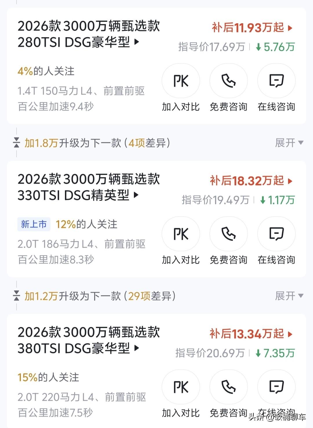 许多人翘首以盼的迈腾330已经上市,此次上市的并非330豪华版,而是330精英版。 其外观和内饰与280/380版本别无二致,可将其视作280版本更换了发动机和变速箱,仪表盘采用的是非全尺寸液晶仪表。 在我所在的城市,补贴后的价格竟达18.32万,比380豪华版的13.34万还贵。我也去打听了,的确是18.32万这个价格,以后应该会降点。 相较于380,330更适合大多数人,330采用进气侧AVS,更加省油;380采用排气侧AVS,动力更为强劲。在如今油价高的情况下,330显然更适合钟情于迈腾的车主。