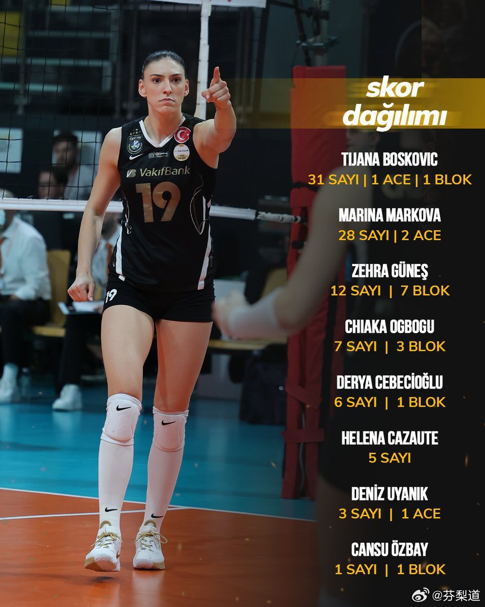 国际排坛动态博斯科维奇瓦基弗银行 3-2(25-14/29-31/22-25/25-22/15-13)伊萨奇巴希瓦基弗银行总场分2-0晋级决赛,与费内巴切争冠瓦基弗银行-伊萨奇巴希进攻:75-67;拦网:13-9;发球:4-5;自失:24-24博斯科维奇30分 56扣28中 4失误3被拦 1拦1发;马尔科娃27分 46扣25中 0失误2被拦 2发;泽赫拉13分 12扣6中 1失误 7拦;奥格博古7分 7扣4中 3拦;德尔亚6分 11扣5中 1拦;卡佐特5分 15扣5中 2失误3被拦;尤亚尼克3分 3扣2中 1发;奥兹巴伊1分 1拦斯蒂夏克24分 46扣23中 4失误3被拦 1拦;卡拉库尔特20分 47扣18中 5失误3被拦 2发;亚普拉克14分 28扣13中 1失误4被拦 1发;杰克11分 19扣6中 5拦;雷特克5分 9扣4中 1发;奥兹德米尔4分 3拦1发;艾里弗.沙辛1分 1扣1中;斯姆雷克1分 1扣1中;普拉默1分 4扣1中