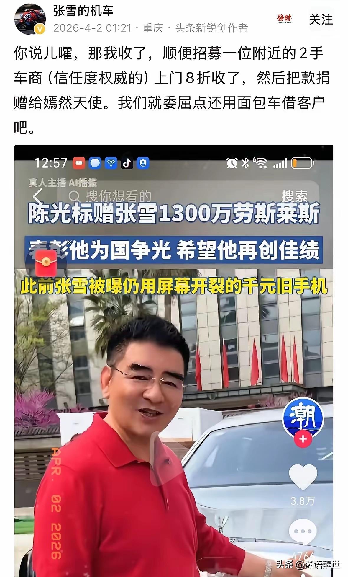陈光标这次可算是碰到硬茬了。 张雪机车夺冠后,陈光标为了蹭热度,公开说要送一辆新款劳斯莱斯给张雪,明眼人都看得出来,这就是想靠炒作博眼球。 他本来以为张雪会礼貌拒绝,没想到张雪直接大方收下,还说车一到手就卖掉,所有钱全部捐给慈善基金。 这一下直接把陈光标架住了。送吧,等于自己掏钱做了善事,好处全是别人的;不送,人设当场崩塌。现在所有人都在看,陈光标到底是真心捐赠,还是只在网上说说而已。