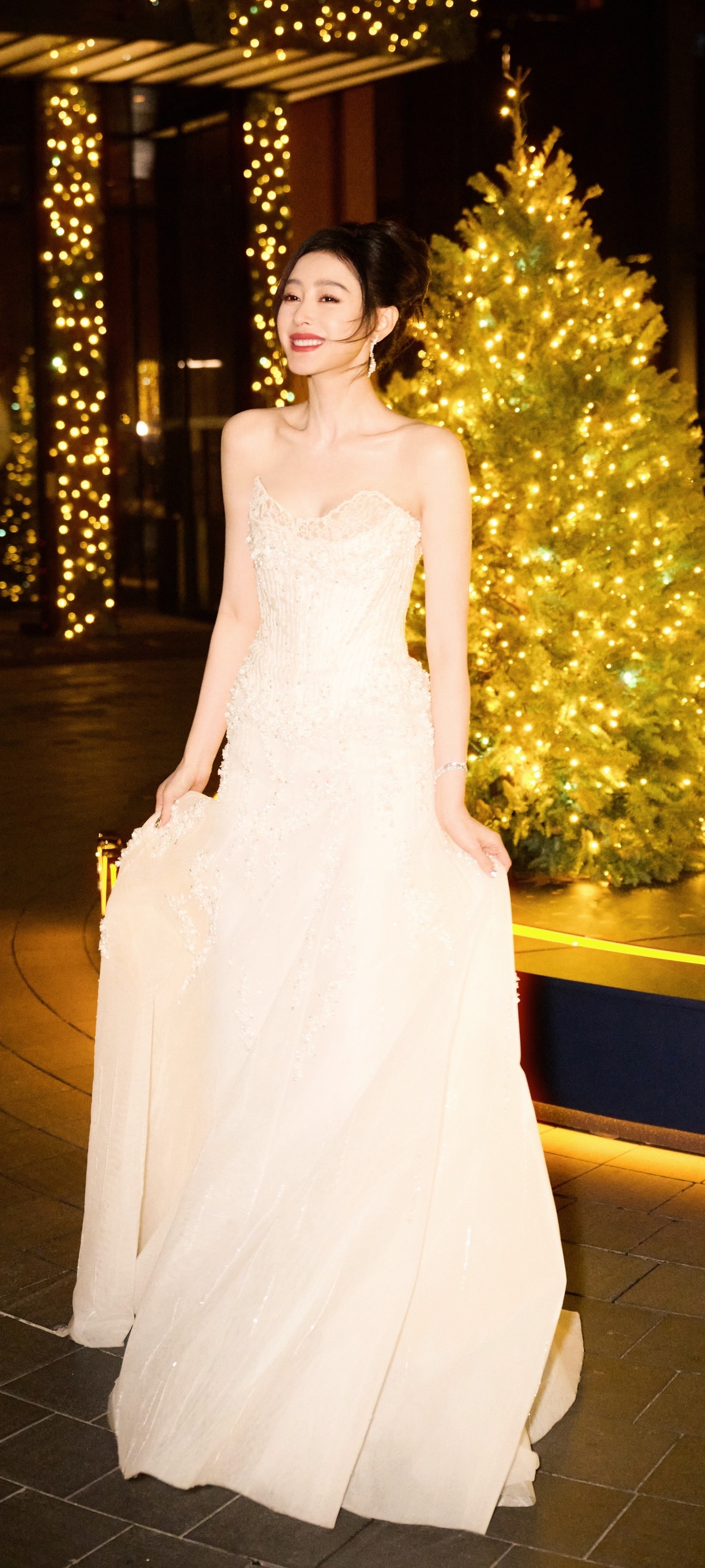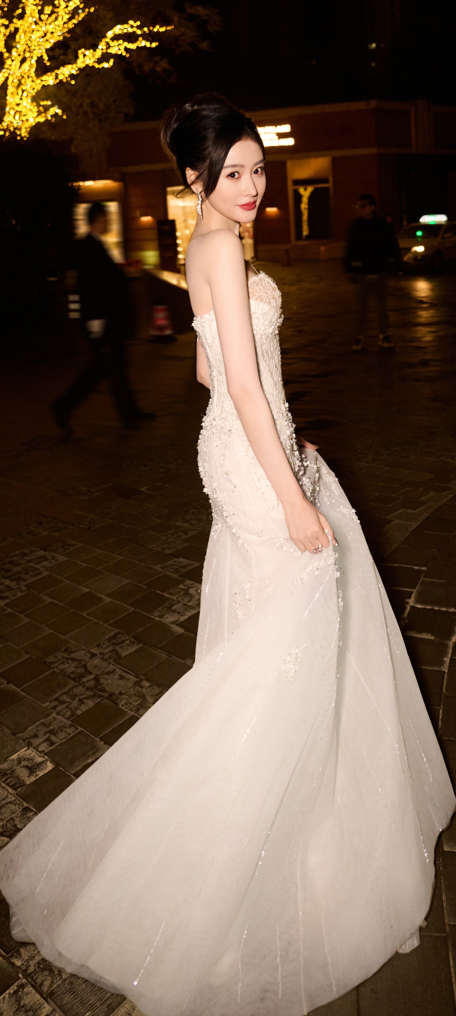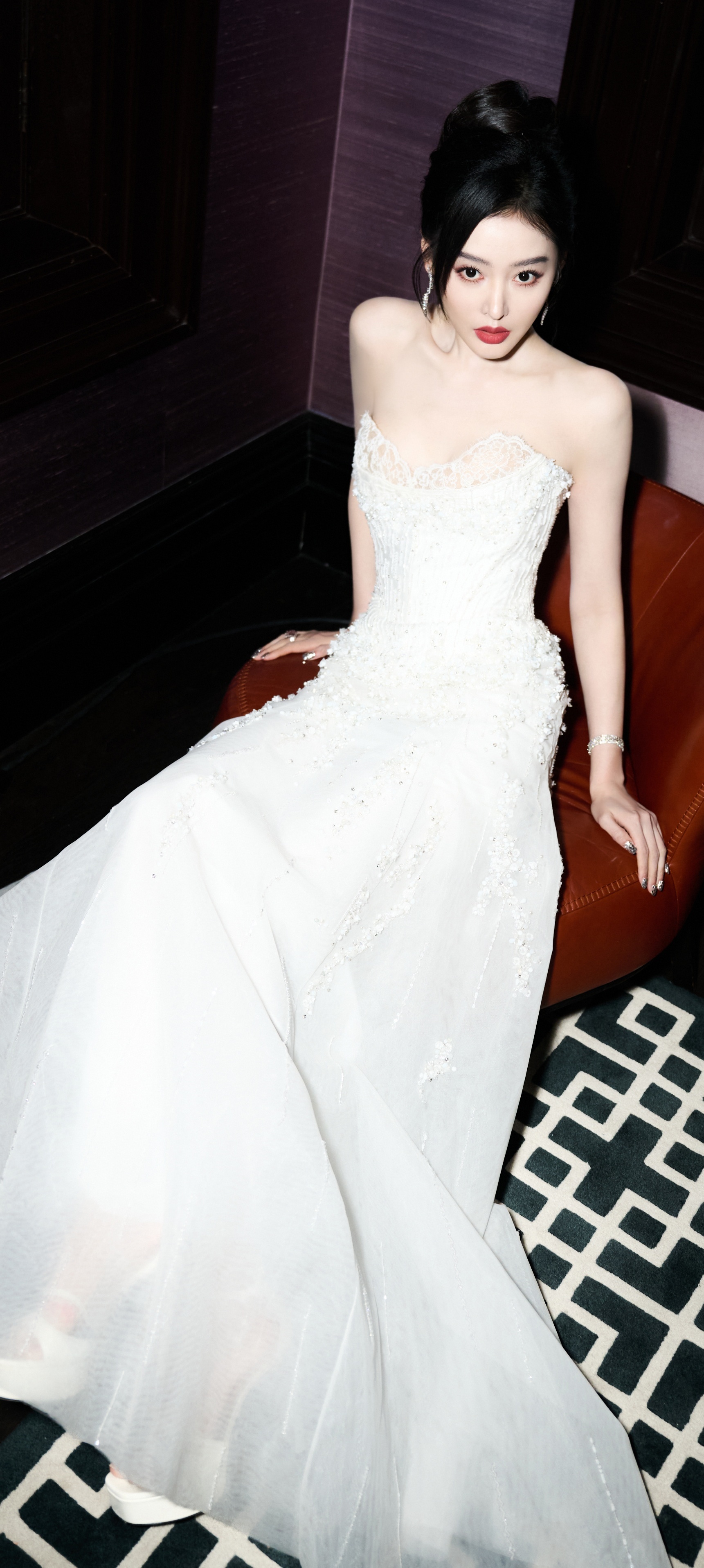 张天爱壁纸级身材,穿搭抹胸蕾丝白裙的大美人。张天爱