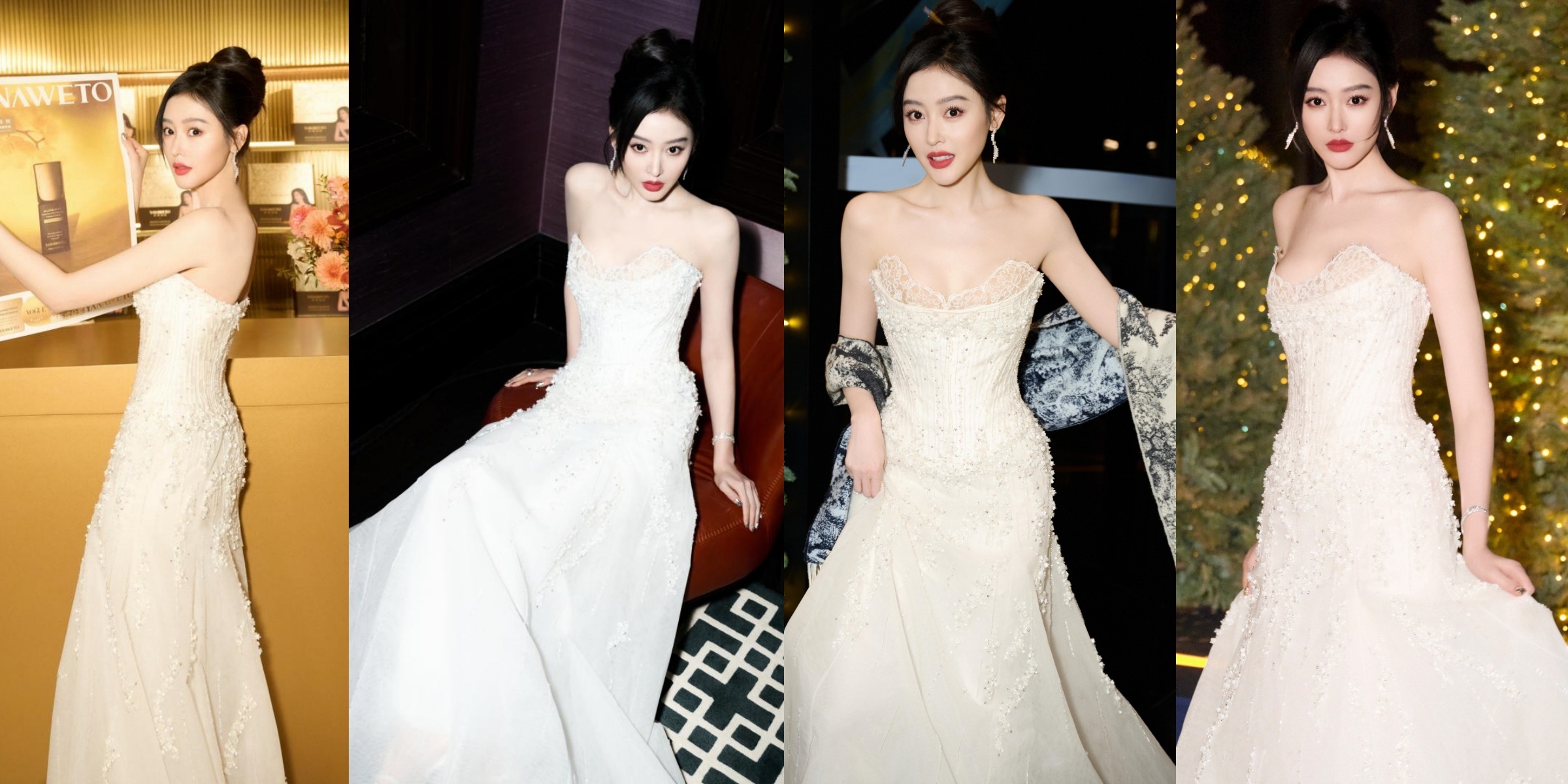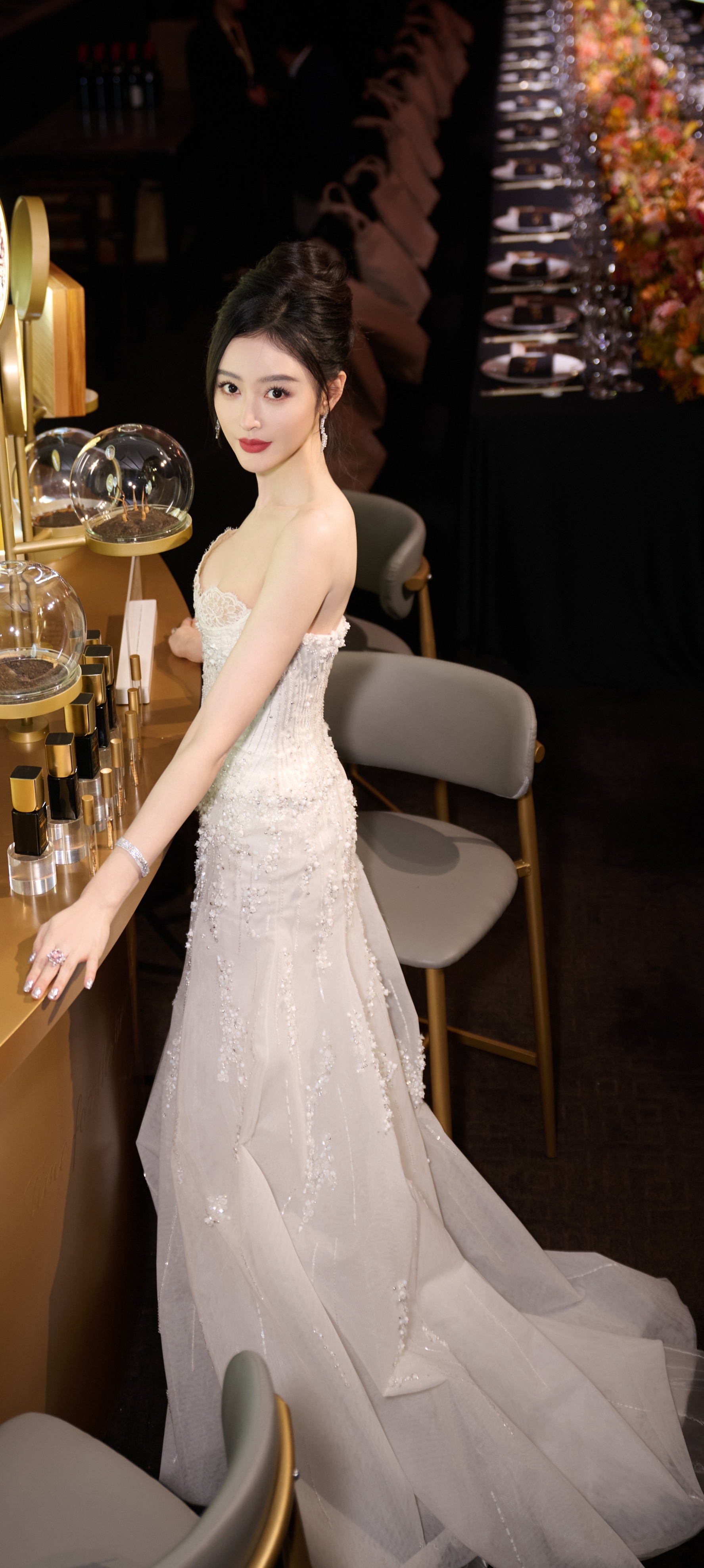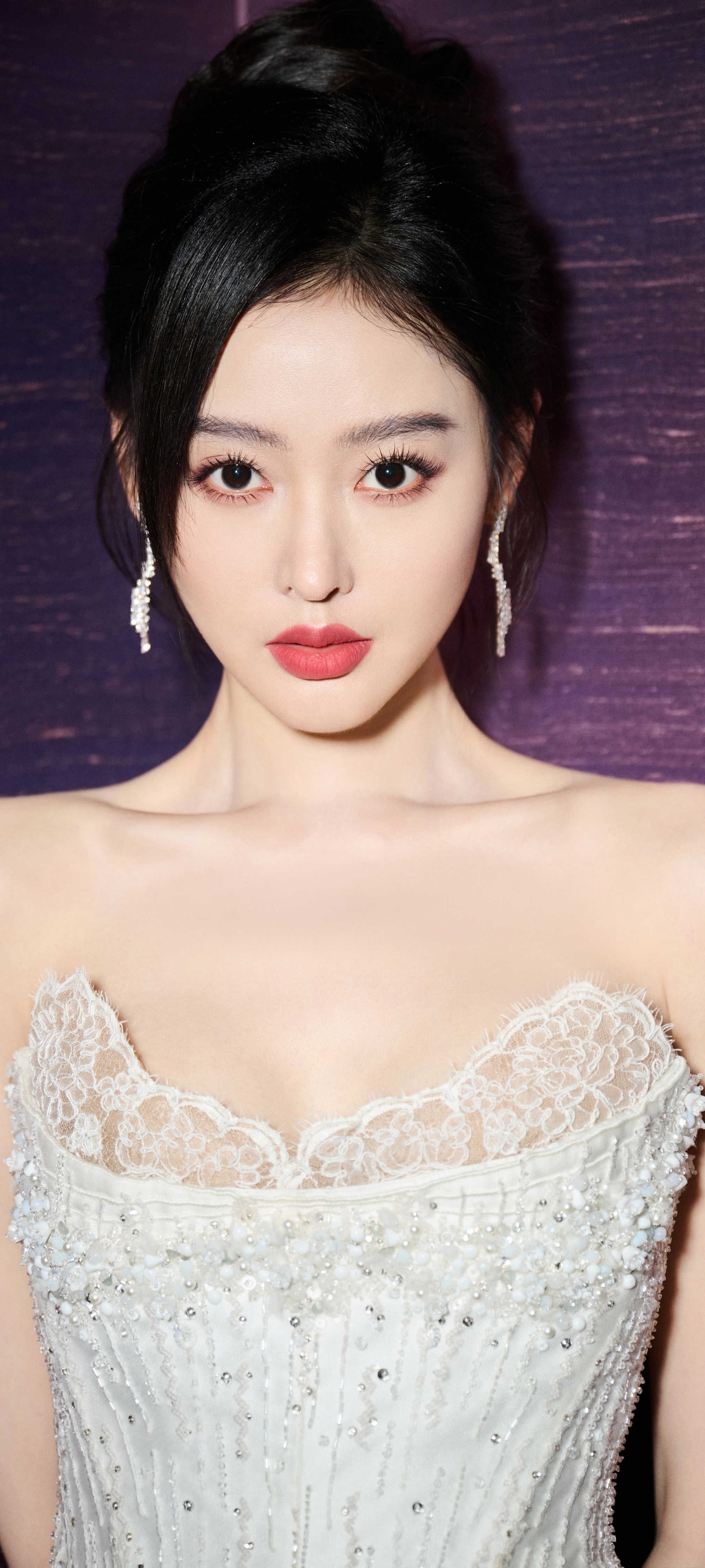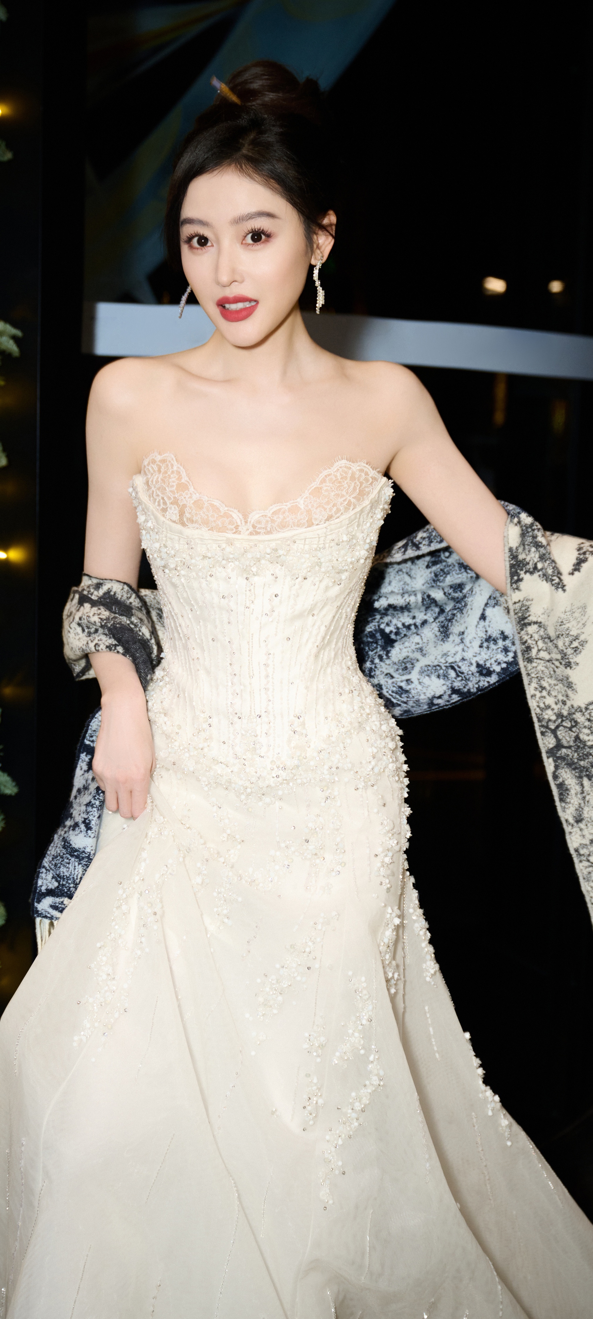 张天爱壁纸级身材,穿搭抹胸蕾丝白裙的大美人。张天爱