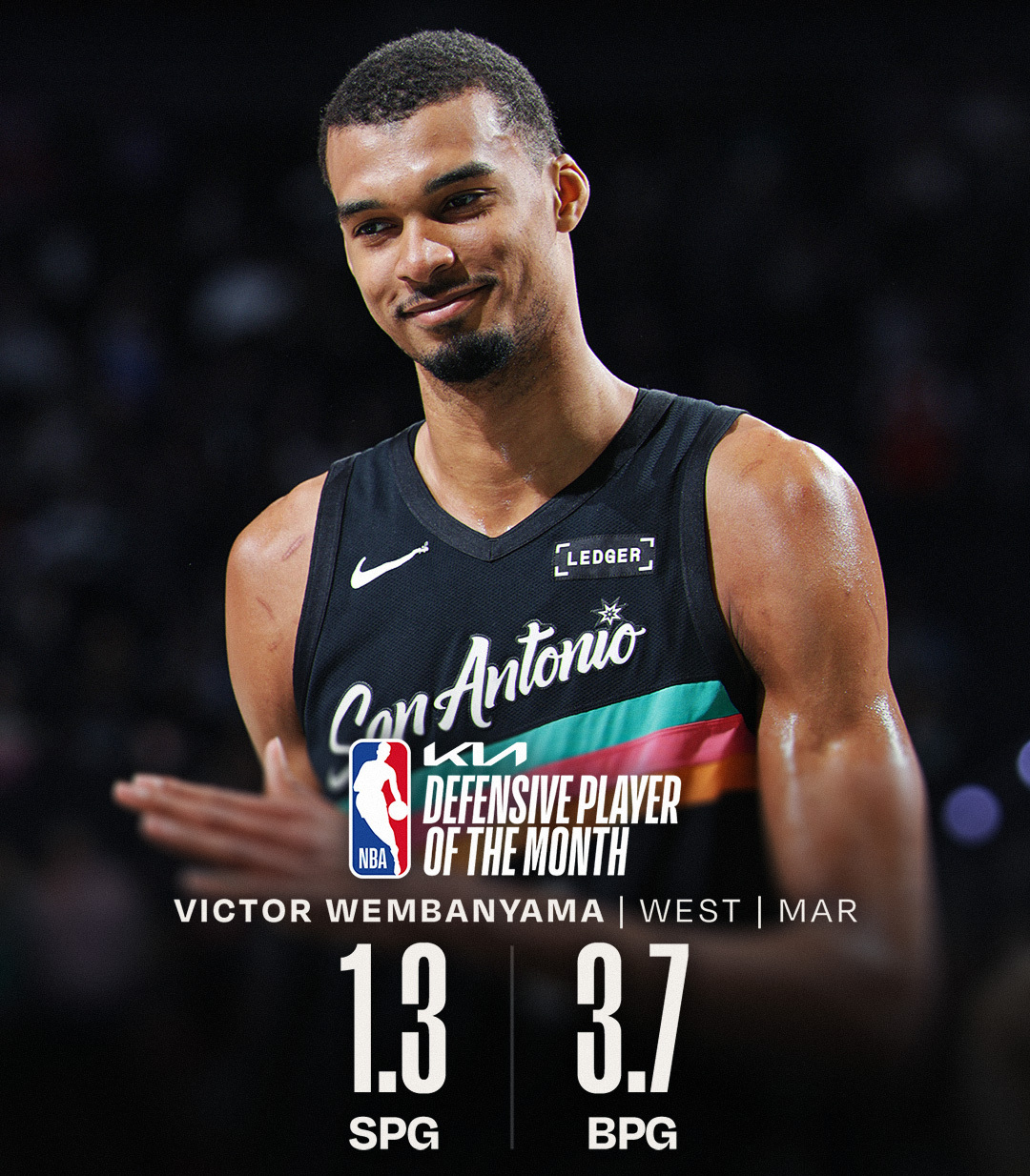 三月份最佳防守球员,东部奥萨尔、西部文班。