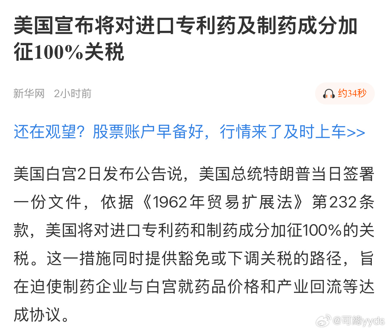 美国白宫2日发布公告说,美国总统特朗普当日签署一份文件,依据《1962年贸易扩展法》第232条款,美国将对进口专利药和制药成分加征100%的关税。这一措施同时提供豁免或下调关税的路径,旨在迫使制药企业与白宫就药品价格和产业回流等达成协议。